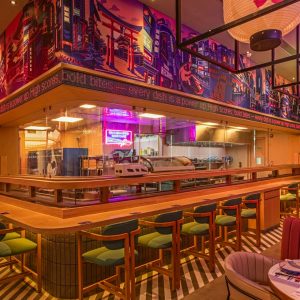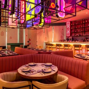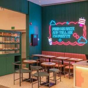 The interiors are a visual playground. Tokyo’s electric energy is brought to life through kaleidoscopic neon lights, layered textures, and manga murals. The café and bar feature retro signage, holographic accents, and vibrant lighting inspired by Tokyo’s nightlife. In contrast, the Bakehouse is bright, soft, and unapologetically playful. Pink-tiled walls, a glowing Live Bakes zone, curated bread shelves, and a neon sign that reads “Feed Me Cake & Tell Me I’m Pretty” create a photogenic, feel-good space. Every detail adds to the brand’s identity, turning the space into more than just a restaurant. It’s a world designed for delight.