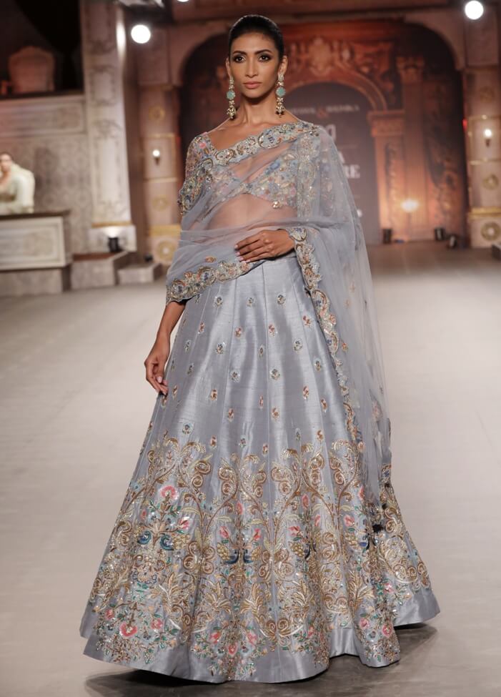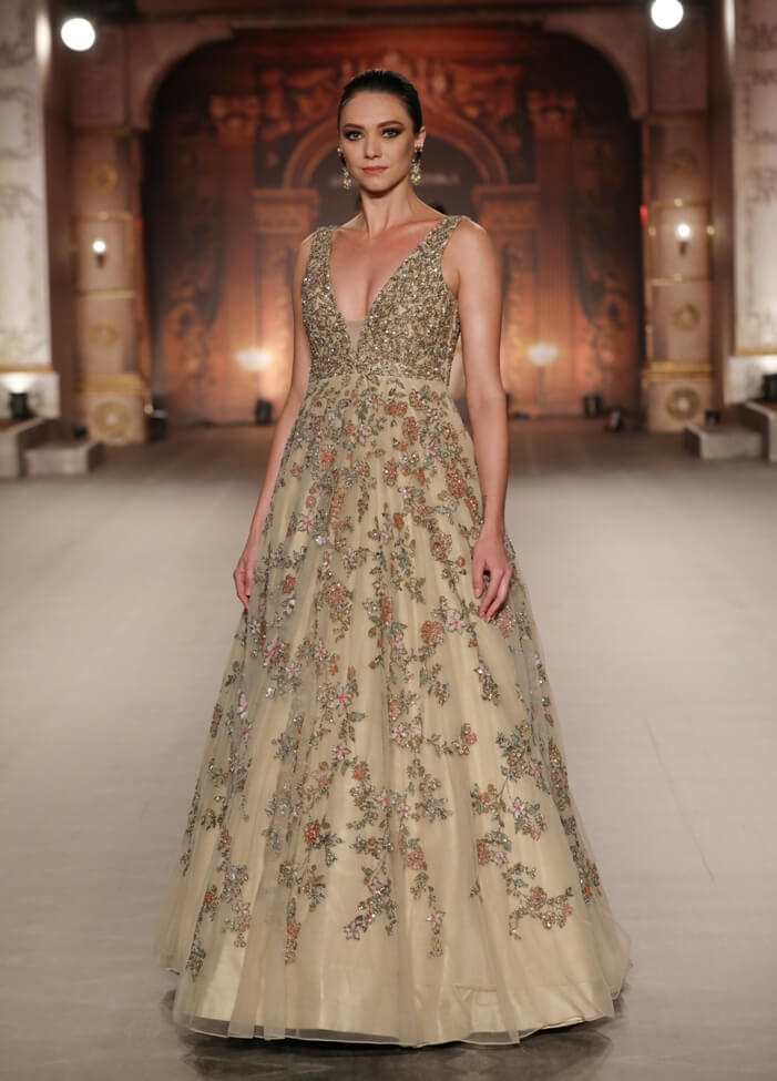 Shyamal & Bhumika couture is an evolution of traditional embroidery techniques using unique materials and fine detailing season after season. One gets to see intricate embellishments and surface ornamentations with elaborate beading, silk thread embroidery and floral motifs in gold zardosi thread. Inspired by inlay samples in museums, vintage European paintings, architectural details, mogul florals, renaissance costumes, and most importantly the 15th century opera theatre set, the designers have used the most colourful silk threads in delicate embroideries that adorn lustrous silks while making a slight departure from the traditional fashion. Shyamal & Bhumika signature cutwork edging and painterly florals signifies the couple’s beautiful love story.
