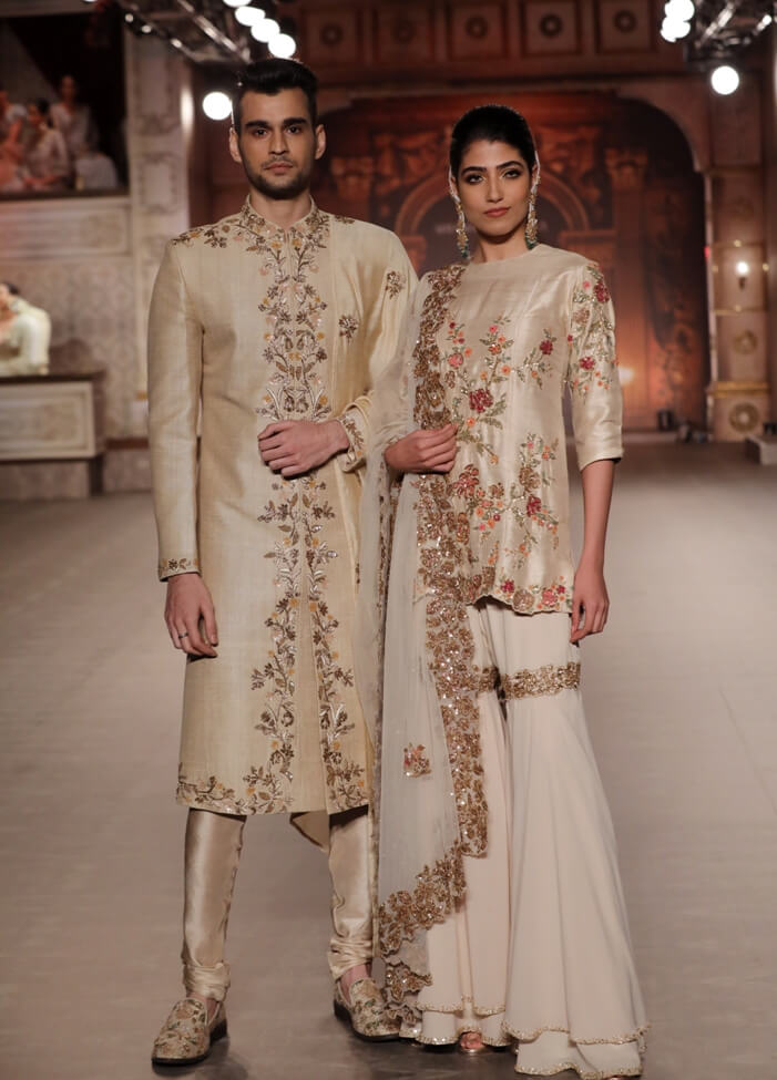 The collection comprises of timeless bridal couture, exquisite men’s sherwani jackets, bias skirts with sensuous cholees, shararas, kalidaar paneled lehengas, trendy shoulder-baring blouses, structures jackets, saris in sheer organzas, asymmetric hemlines, signature cowl dresses, trailing kalidaars, exquisitely crafted veils, peplum tops, poet sleeves, georgettes & translucent tulle and fun details for brides and grooms for a perfect romantic feel on their big day. Shyamal & Bhumika menswear is designed in understated handwoven tussars, matkas and moonga variety of silks making it unconventionally elegant.