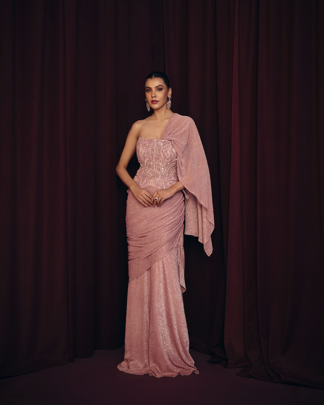 This Soft Blush Ensemble Features A Sculpted, Intricately Embellished Corset Paired With A Gracefully Draped Skirt That Hugs The Silhouette In Fluid Layers. The Delicate Shimmer And Couture Detailing Lend A Romantic, Ethereal Allure. Effortlessly Feminine And Refined, It’S A Perfect Choice For Cocktail Evenings And Elegant Celebrations.