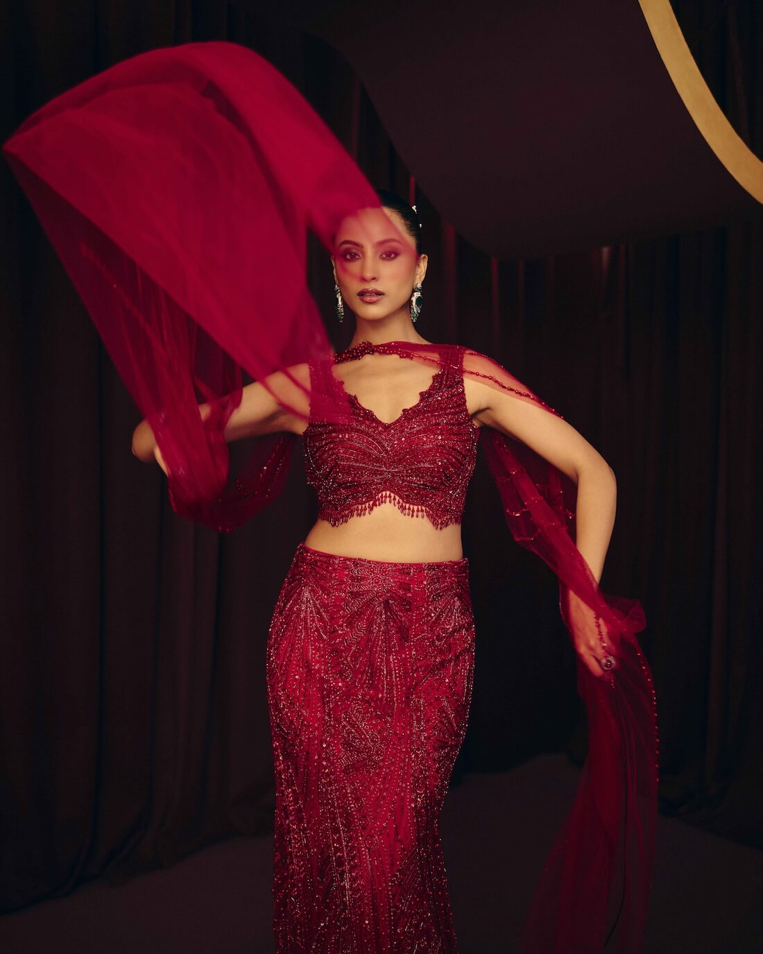 This Opulent Deep Red Ensemble Is Paired With A Heavy, Richly Embellished Skirt And Matching Dupatta, Creating A Powerful And Luxurious Statement. Intricate Beadwork And Sequin Detailing Add Depth And Sparkle, While The Sheer Dupatta Brings Fluidity And Drama To The Look. A Bold, Glamorous Choice For Cocktail Nights, Sangeet, And High-Fashion Bridal Celebrations.