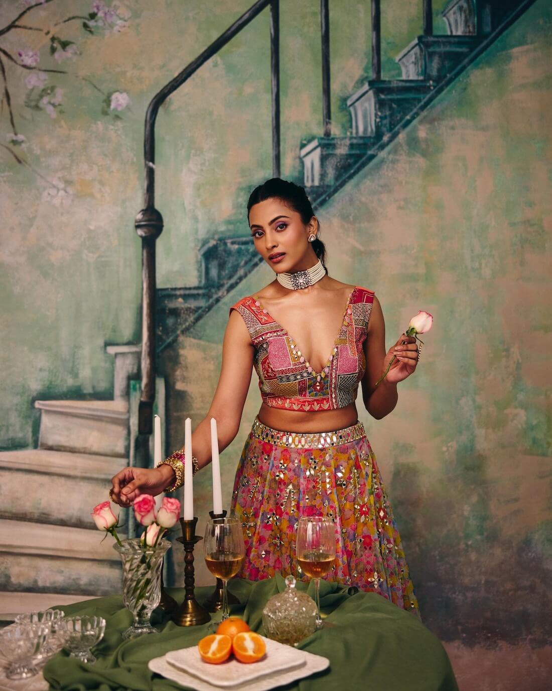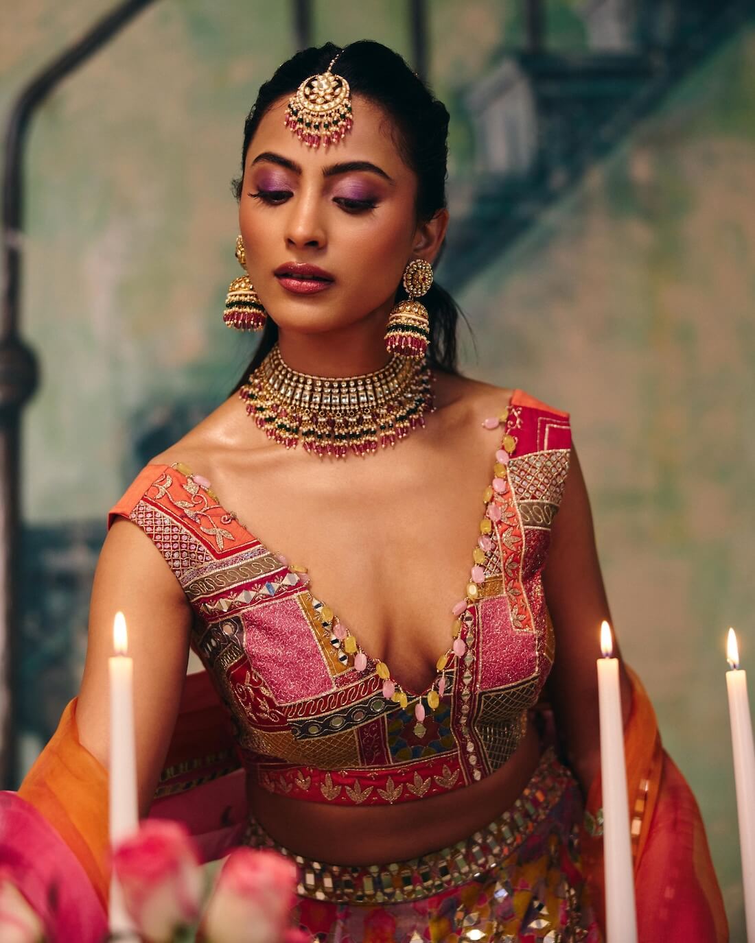 This Couture-Inspired Lehenga Features Vibrant Florals Adorned With Intricate Mirror And Sequin Detailing.The Structured Embroidered Blouse Adds A Bold Yet Refined Silhouette.A Voluminous Skirt With Scalloped Edges Creates Graceful Movement And Sparkle. Finished With An Ombré Dupatta, It’S A Perfect Blend Of Modern Elegance And Festive Charm.