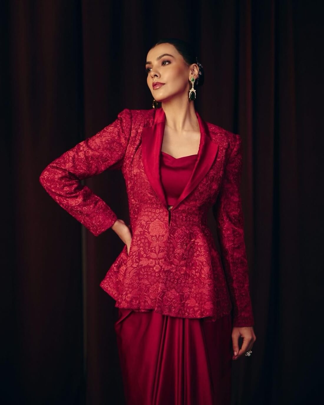 This Striking Scarlet Ensemble Pairs A Sculpted, Peplum-Cut Jacket In Rich Textured Fabric With A Fluid Satin Drape Skirt, Creating A Powerful Yet Elegant Silhouette. The Structured Lapels And Tailored Fit Add A Sharp Couture Edge, While The Soft Fall Of The Skirt Brings Graceful Movement. A Perfect Fusion Of Modern Tailoring And Timeless Glamour, Ideal For Cocktail Evenings And High-Fashion Festive Soirées.