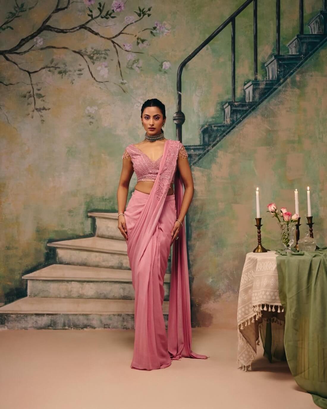 This Elegant Drape Set In A Soft Dusty Rose Tone Features A Delicately Embroidered Blouse With Lace Detailing And A Fluid, Satin-Finish Skirt For A Graceful Silhouette. Designed To Flatter With Its Structured Bodice And Effortless Fall, It Blends Modern Romance With Timeless Sophistication—Perfect For Cocktail Soirées And Intimate Celebrations.