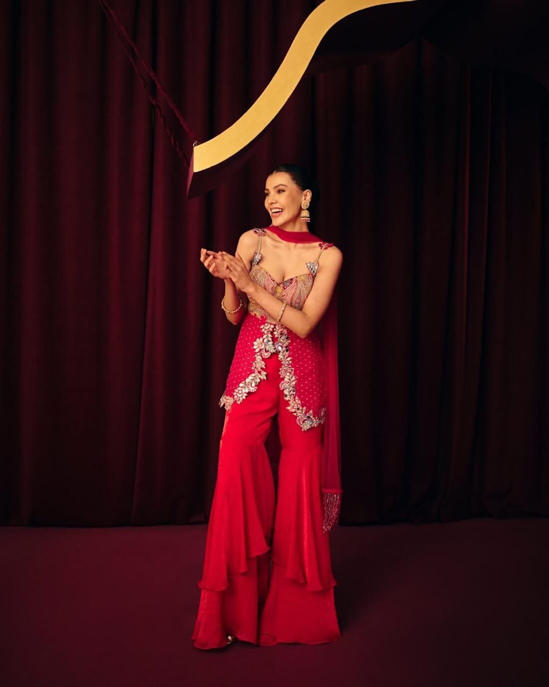 This Striking Red Sharara Set Features A Sculpted Corset Adorned With Intricate Paisley Embroidery And Delicate Floral Strap Detailing. The Flowing, Tiered Sharara Pants Are Elevated With Mirror And Thread Work, Creating Beautiful Movement And Drama. Finished With A Sleek Dupatta Neckline Detail, This Ensemble Is Perfect For Sangeet Nights And High-Glam Festive Celebrations.