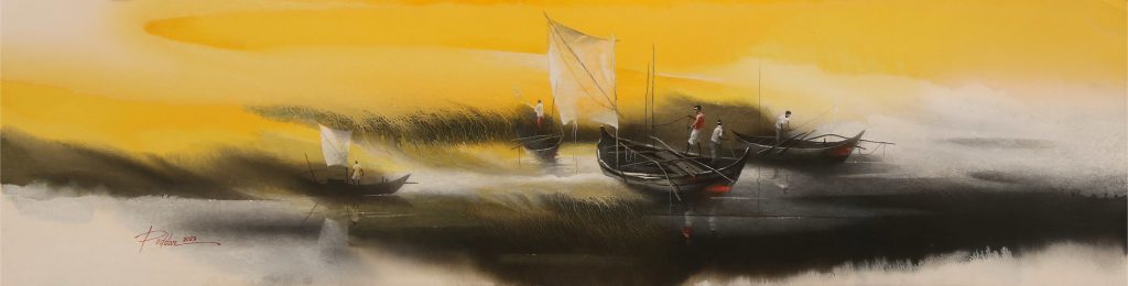 Poddar’s artistry is characterized by the fusion of Indian miniature art’s intricate detailing with the fluidity of Chinese and Japanese calligraphic techniques. His landscapes often depict serene rural scenes—ruined temples, weathered habitations, boats by the waterside—imbued with a translucent glow and meticulous architectural elements. This synthesis captures the essence of nature and human presence in a delicate balance.
