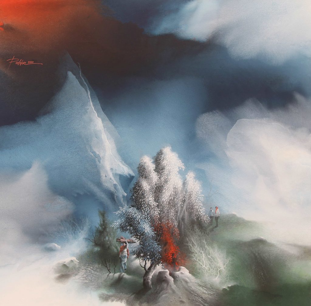 Employing the wash technique, Poddar paints on wet paper, allowing colors to blend seamlessly and create ethereal atmospheres. This method demands swift execution, as the water dries quickly, challenging the artist to complete his vision within a limited timeframe
