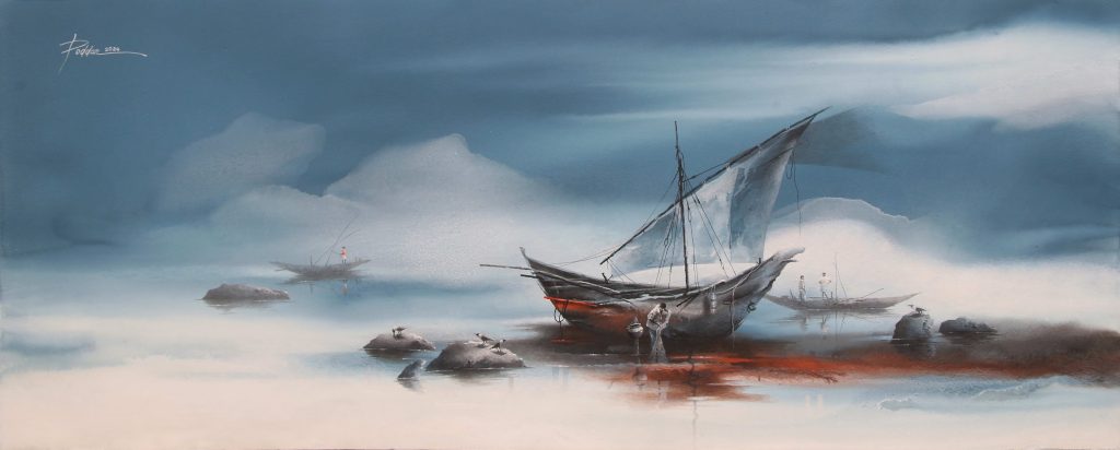 Poddar’s artistry is characterized by the fusion of Indian miniature art’s intricate detailing with the fluidity of Chinese and Japanese calligraphic techniques. His landscapes often depict serene rural scenes—ruined temples, weathered habitations, boats by the waterside—imbued with a translucent glow and meticulous architectural elements. This synthesis captures the essence of nature and human presence in a delicate balance.