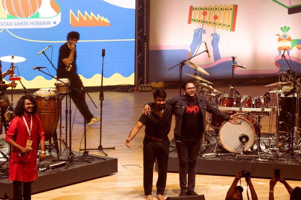 The second day saw the musical duo, SNAX, comprising Ramkumar Kanakarajan and Sumesh Narayanan, take stage with their electrifying performance. The duo brought their signature styles, incorporating Tamil kuthu beats, metal, and dubstep, while performing their debut album, Thrillex. Ramkumar’s synthesis of rock, metal, and electronic drumming, accompanied by Sumesh’s energetic mridangam, was a palatable fusion for the fans of both modern and classical schools of percussion.
