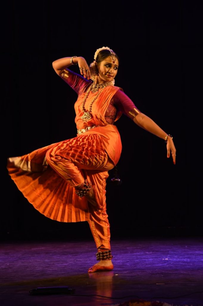 Arohi Munshi presented two traditional compositions choreographed by her mother, Guru Dr. Lata Munshi. The first composition, “Shringara Lahiri” by Lingaraj Urs, was set in the Raagam Neelambari to Adi taalam. It described the goddess as the embodiment of art and music, holding a veena and representing beauty and rhythm. The second composition, “Krishna ni begane baro” by Vyasatirtha, was set in the Raagam Yamuna Kalyani to Mishra Chaapu taalam. It portrayed Mother Yashoda calling out to Krishna, describing his divine beauty and playful nature.