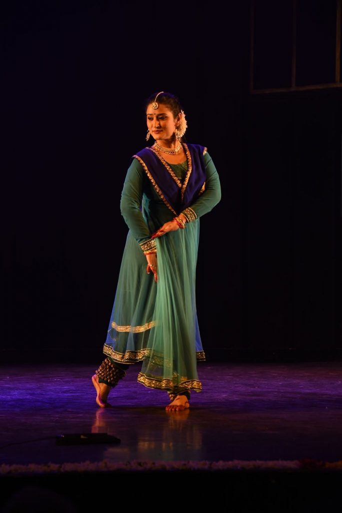 Her second presentation was an abhinaya piece, a traditional Banaras Gharana thumri titled “Dagar beech kaise chalu mangdado kanhaiyyabe beer.” Radha pleaded with Krishna to let her go, expressing mixed emotions when he didn’t. Guru Uma Dograji had integrated lines from Dharamveer Bharati’s “Kannupriya” to deepen the emotional impact. The thumri was set in Raag Mishra Khamaj, Dadra Taal, and was sung by Shailendra Bharati ji.