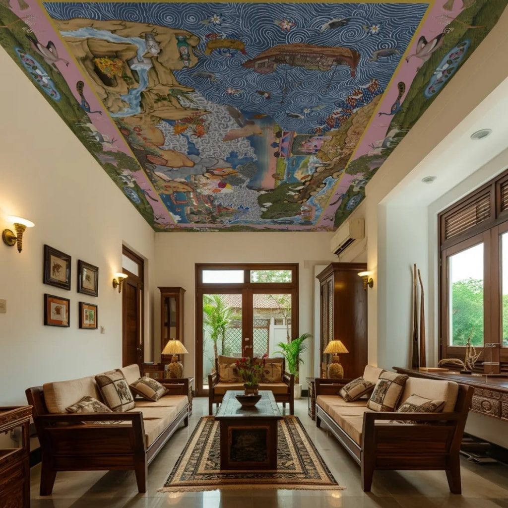 This exquisite ceiling wallpaper unfolds a panoramic scene of mythical creatures, flowing rivers, and verdant landscapes, inspired by Indian artistic heritage. It casts a spell overhead, inviting viewers into a world of elegance and imagination.