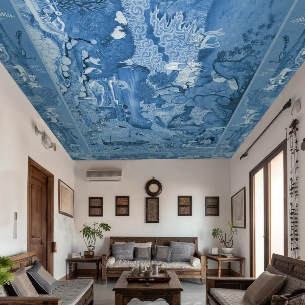 This exquisite ceiling wallpaper casts a serene spell over the room, transforming the ceiling into a vast canvas of blues inspired by traditional Indian art. It creates an ethereal, almost dreamlike landscape overhead, with mythic scenes and cascading waterfalls, evoking a tranquil sky that feels both timeless and transportive.
