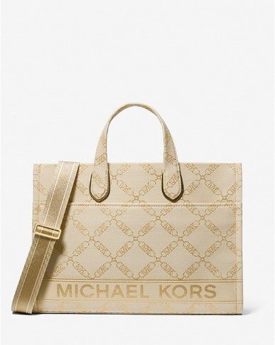 For Spring 2023, MICHAEL Michael Kors introduces Gigi – she is the new girl on the block- featured in the empire logo Jacquard. The Gigi tote is guaranteed to complement almost any outfit thanks to its neutral logo chain jacquard pattern. The large, rectangular shape is perfectly sized to carry all your daily essentials, and it comes with a crossbody strap for added versatility.