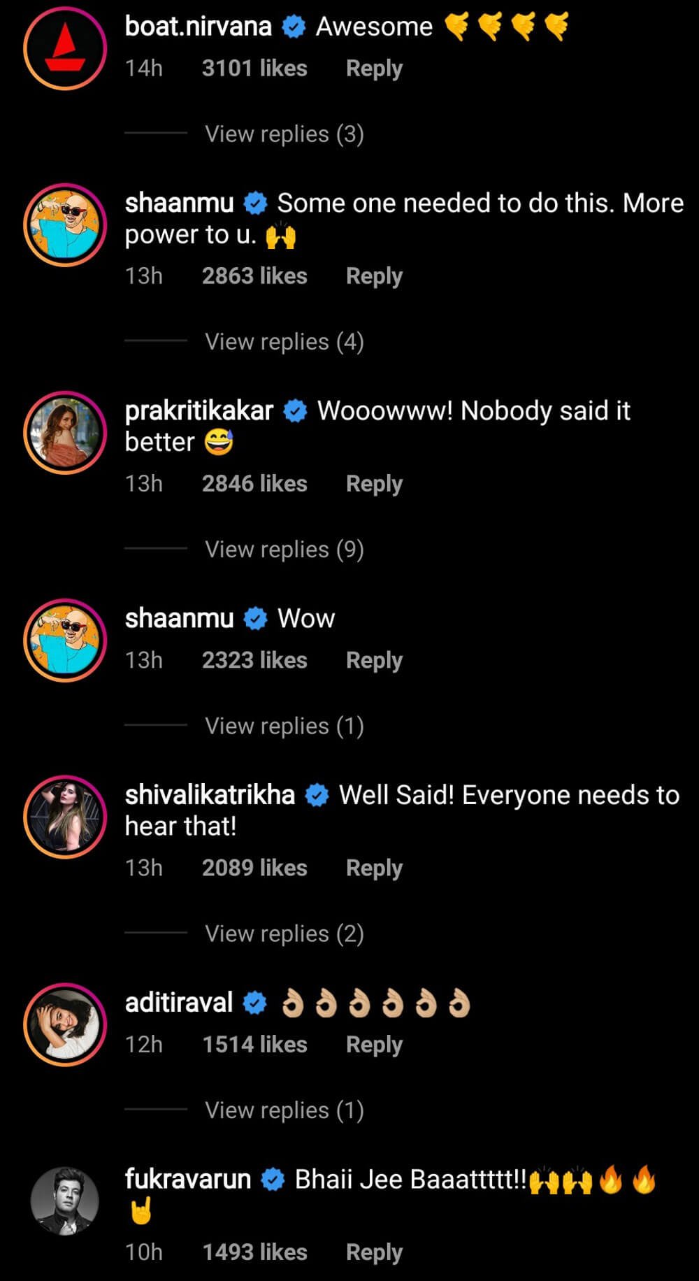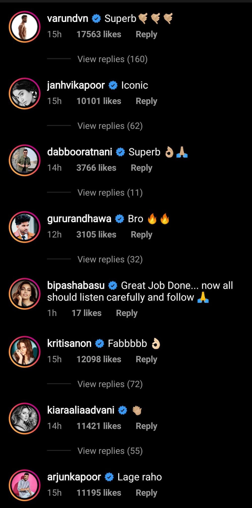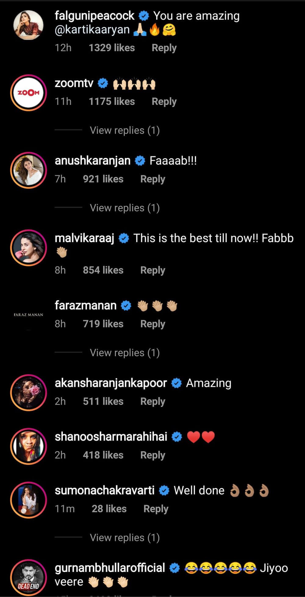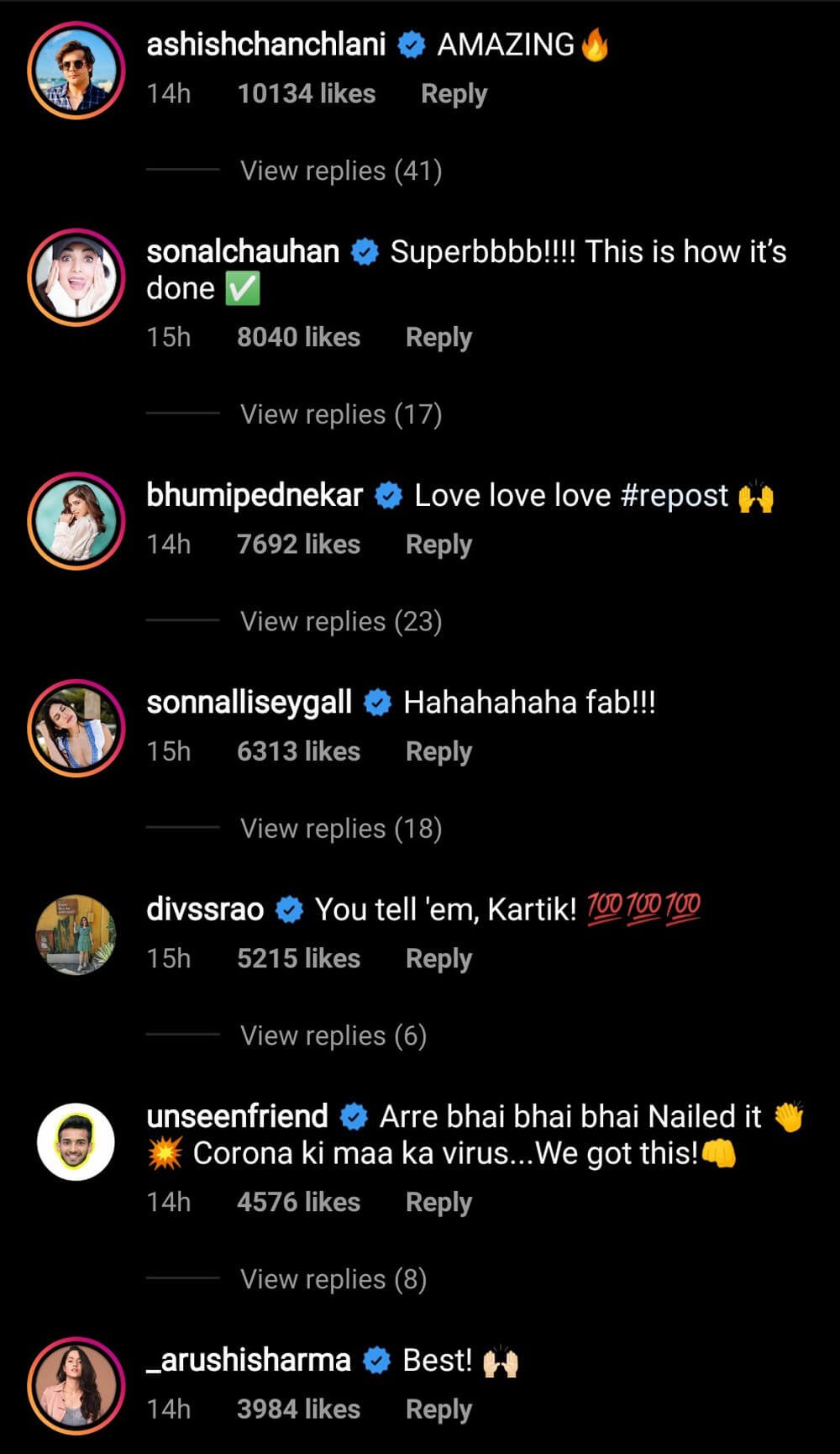 Within minutes of posting, Kartik Aaryan’s video was a hit and flooded with comments by his friends from the film industry, see: