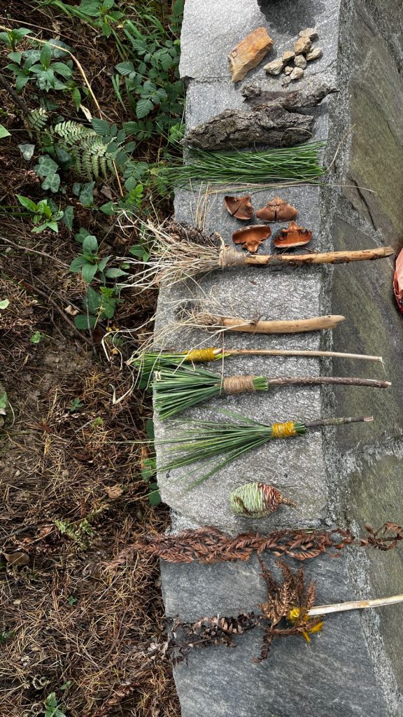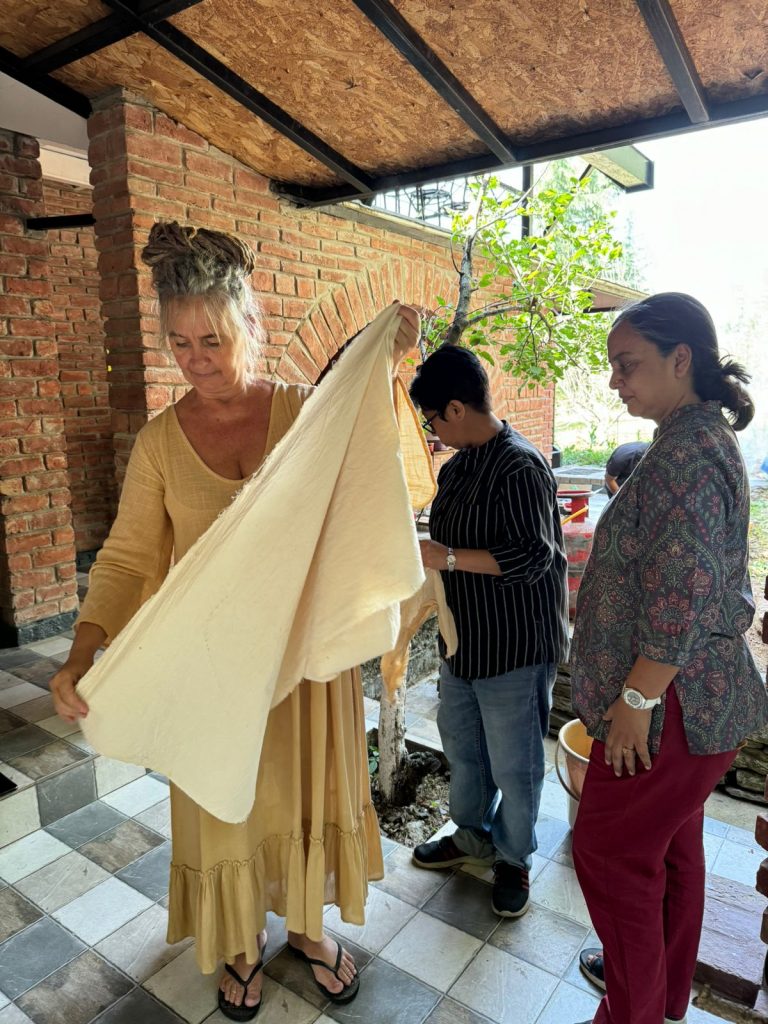 She introduced the concept of wild Art and eco-dyeing with Shibori techniques during this Course. The Course was designed to have two art skill components which included Eco-dyeing using Shibori techniques to produce art work on natural calico fabric and Wild Art using natural pigments and brushes. In the latter the participant artists learnt how to make their own natural paints or pigments and ‘brushes’ from materials from the surrounding forest area.
