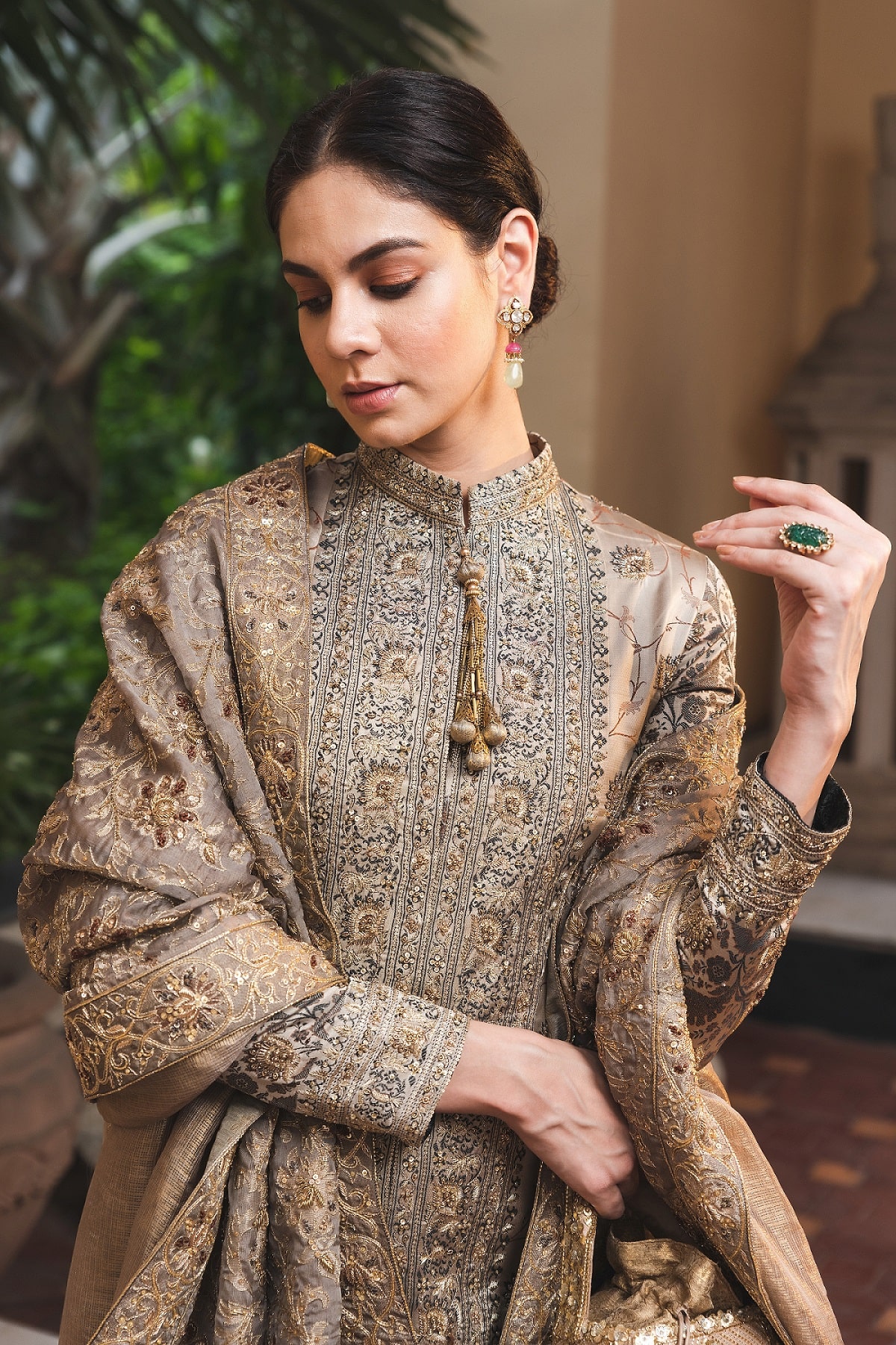 The collection combines delicate hand embroidery with meticulously curated woven textiles with classic AL royal authentic silhouettes worn by maharanis in palaces in the Mughal era. Through our interpretation, the brand aspires to reflect a poetic flow in volume, layers, and impeccable garment construction which characterizes the unique beauty of ‘Nazm-e-Mahal’.
