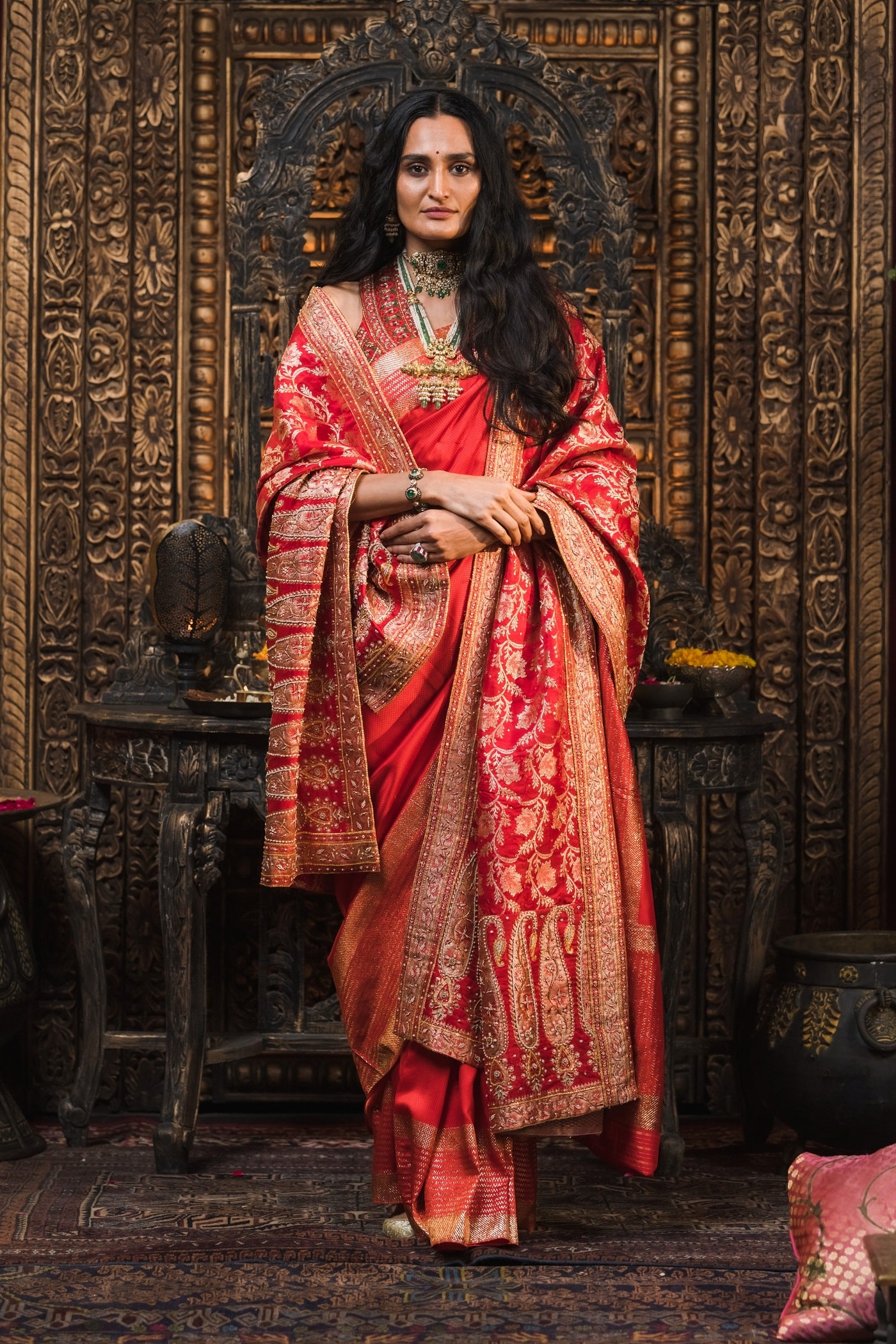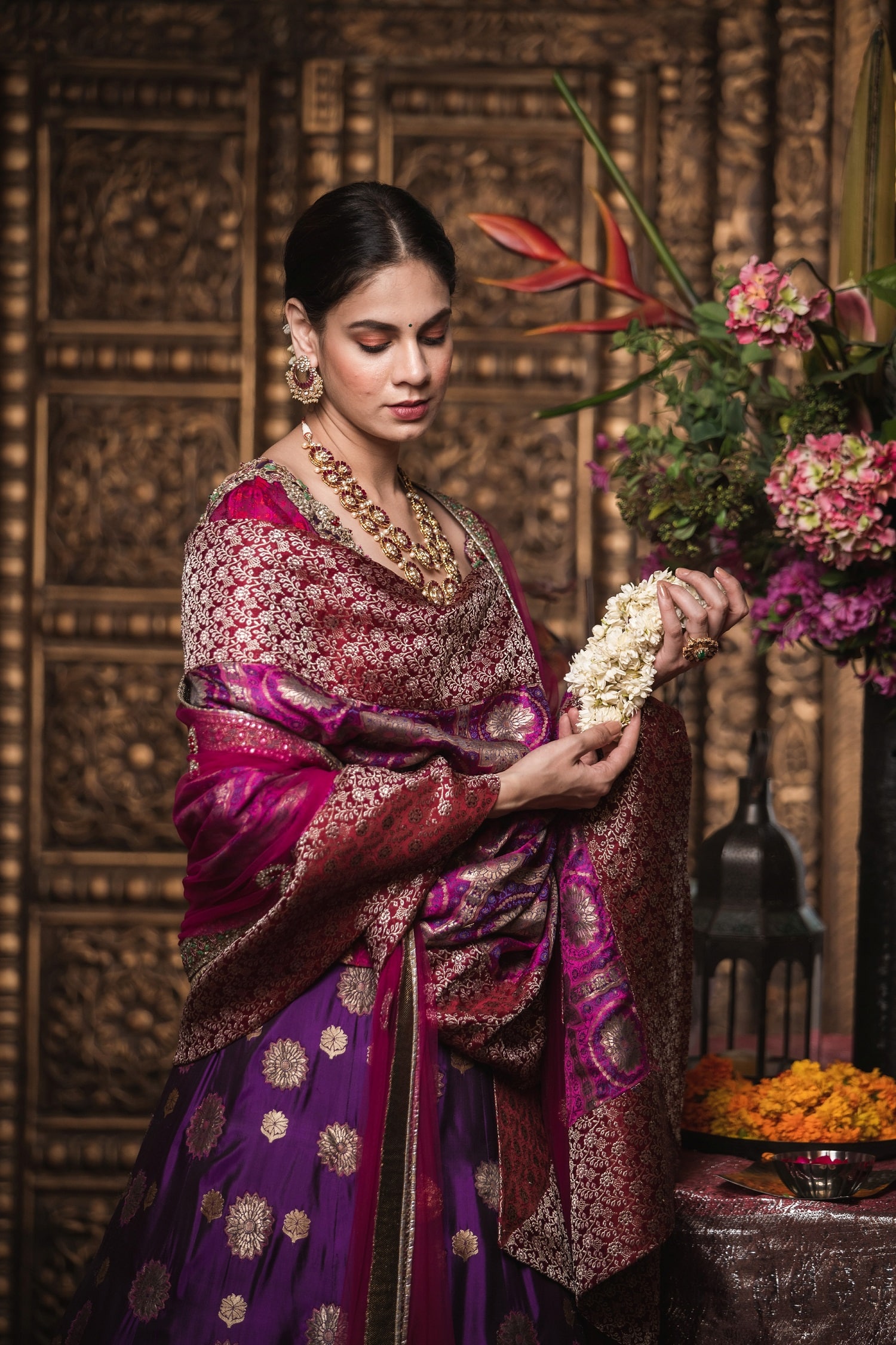 The high point of this collection is its antique brocade sarees which have been sourced from the original wardrobes of the maharanis from their palaces of Rajasthan, and have been restored by our own weavers from Banaras. The warp and the weft of the weaves are infused with pure gold and pure silver strains the technique, which has become extinct over the years. The subdued beautiful colors of light turquoise, light pink, light peach, and vibrant purple coupled with rich heavy weaves of the beautiful antique sarees. These saris speak of the classic and subdued taste and style of maharanis of that era, who adorned the beauty of their royal life in their palaces.