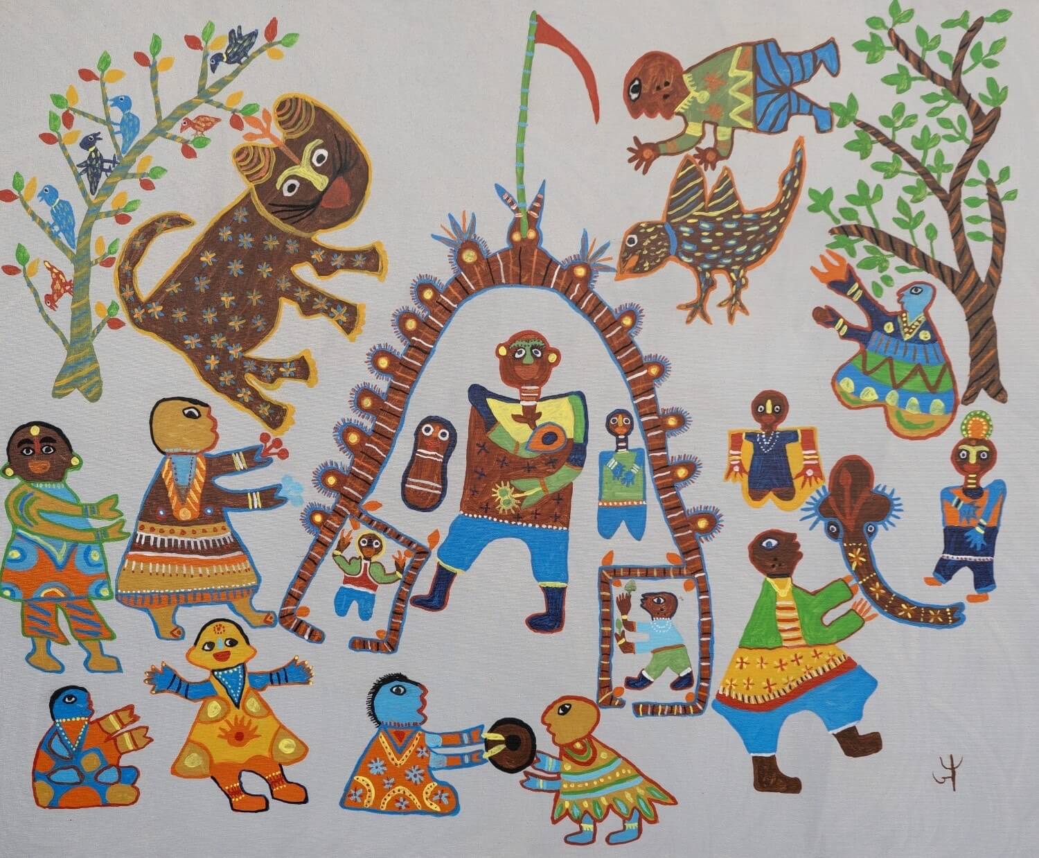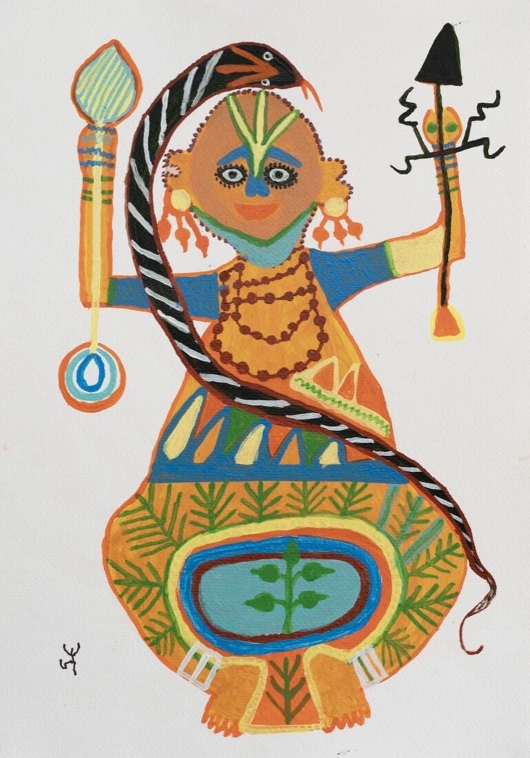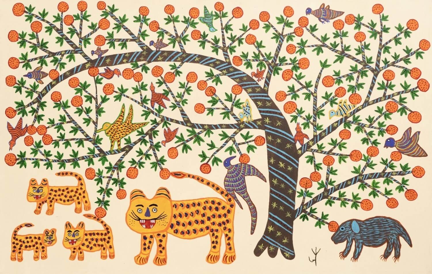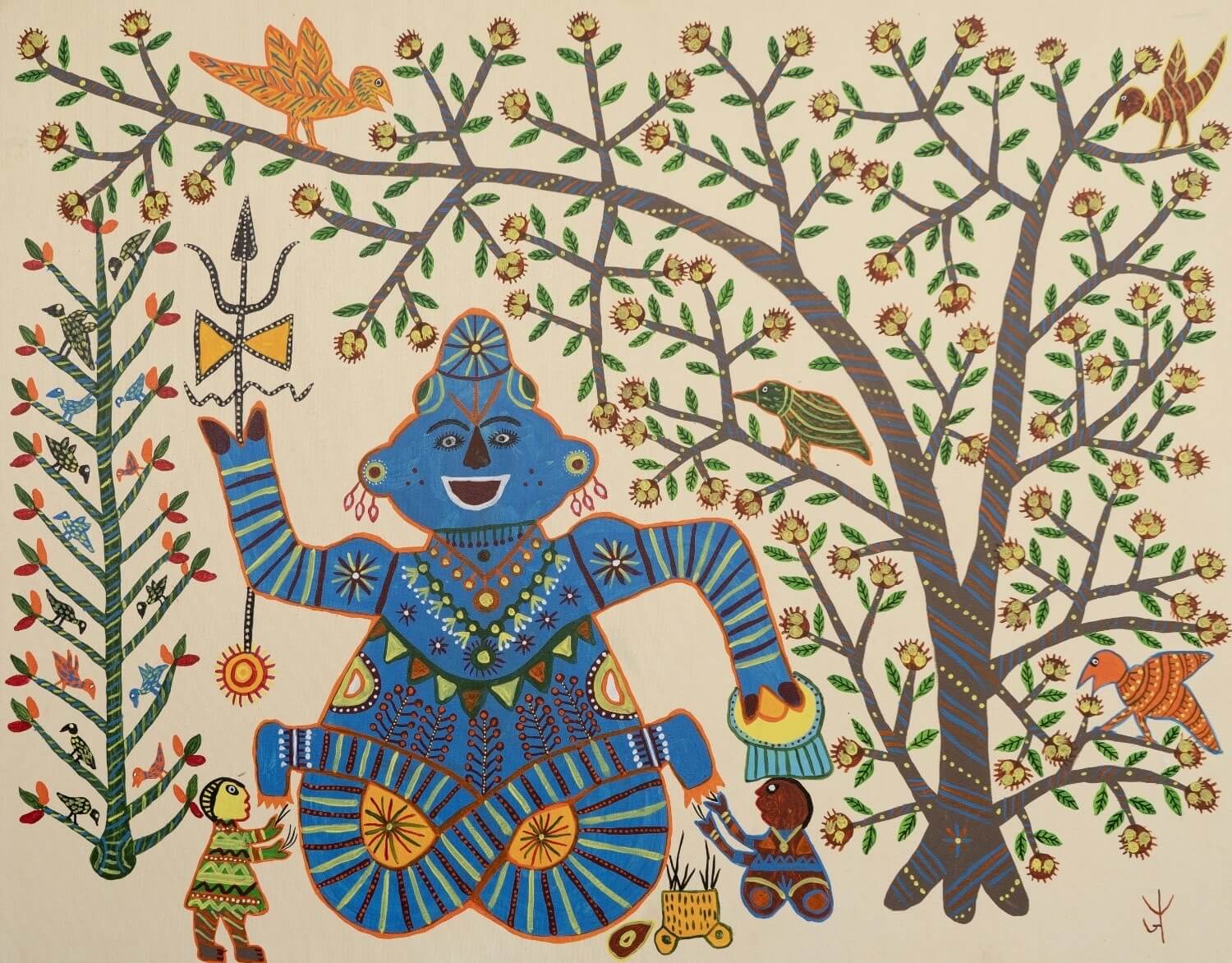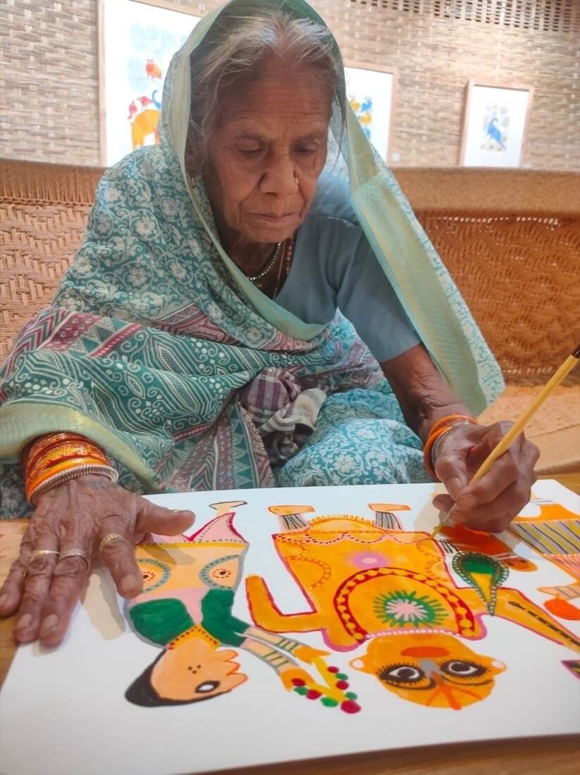 In the quiet forests of Umaria in Madhya Pradesh, Jodhaiya Bai rose like a bright flame, turning a lifetime of struggle into a radiant artistic vision. After years spent gathering firewood, collecting forest produce, and working as a labourer to support her family, she stepped into a new life as an artist in her late sixties. With gentle guidance from artist Ashish Swami (1962–2021), who established an arts centre near her home, she discovered her creative voice, first shaping clay and painting on gourds and papier mâché plaques and eventually blossoming into a painter known for her luminous acrylic works on paper and canvas.