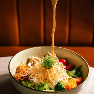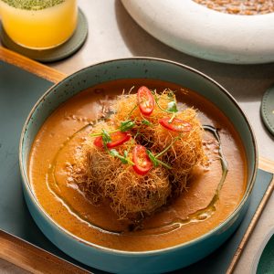 Fans of Asian cuisine will relish the Mala Spiced Chicken Dumpling, where succulent chicken meatballs are wrapped in a crisp wonton shell and served with a fiery mala-style sauce, delivering the perfect balance of heat and umami. Bringing the essence of the Middle East to the table, the Mezze Platter offers a generous spread of Mediterranean favorites, complemented by freshly baked pita bread and crisp lavaash sticks, making it an ideal choice for sharing. For those craving comfort in a bowl, the Veg Khow Suey presents a rich and aromatic curried coconut broth, brimming with assorted vegetables, crispy noodles, and an array of traditional condiments, ensuring a delightful explosion of flavors in every bite.