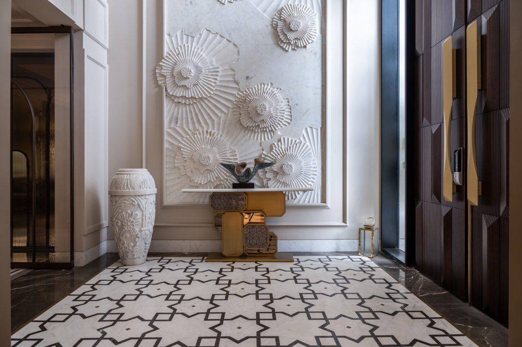 textural and material elements shine. Handcrafted marble cladding with CNC detailing, layered wall