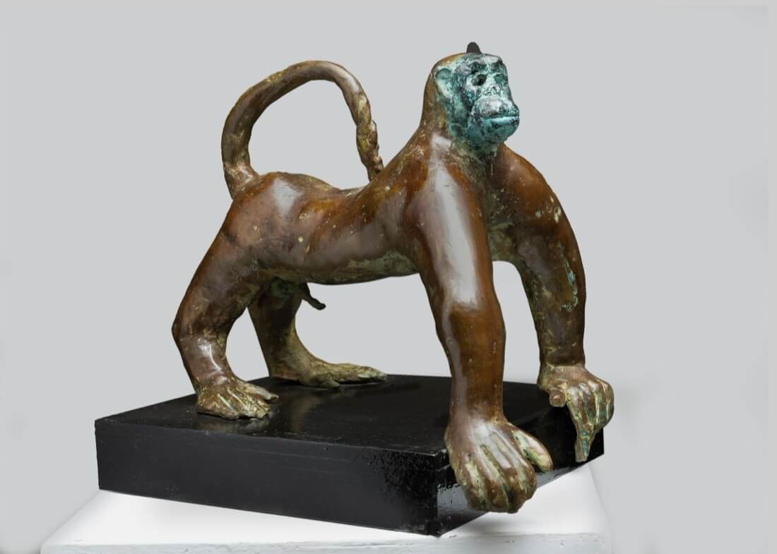 Kiran Dixit Thacker, the only living female disciple of Ramkinkar Baij, has built a formidable body of work over decades. Her practice is rooted in figurative sculptures and informed by geometric forms and a rigorous armature that gives strength to her surfaces. Many of the watercolours, paintings and drawings in the exhibition were created during her years in London, while the bronze, stone and mild steel sculptures were produced at her studio in Santiniketan. The show includes standout pieces such as The Goat, Three Santhal Men, Woman with her Hens Cocks, towering palm trees with peacocks, and sensitive bronze works like Owls, Lovers and Monkeys—each demonstrating Kiran’s meticulous attention to detail and her tactile command of metal and other materials.