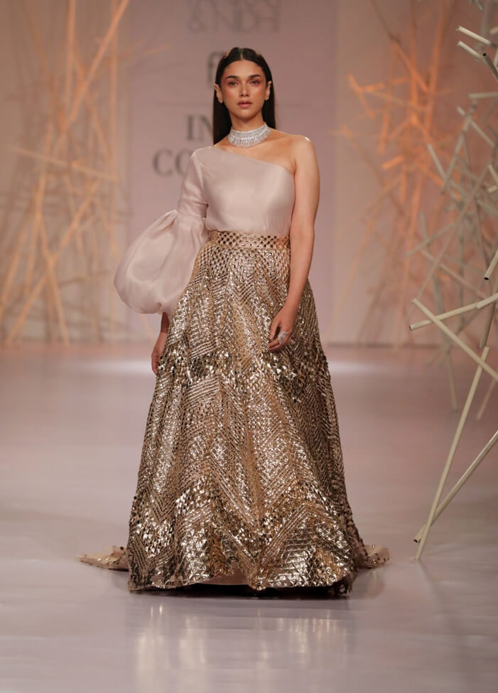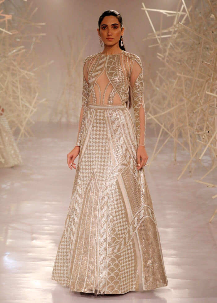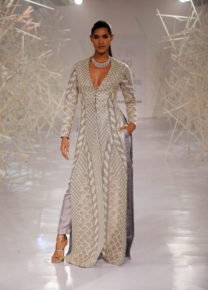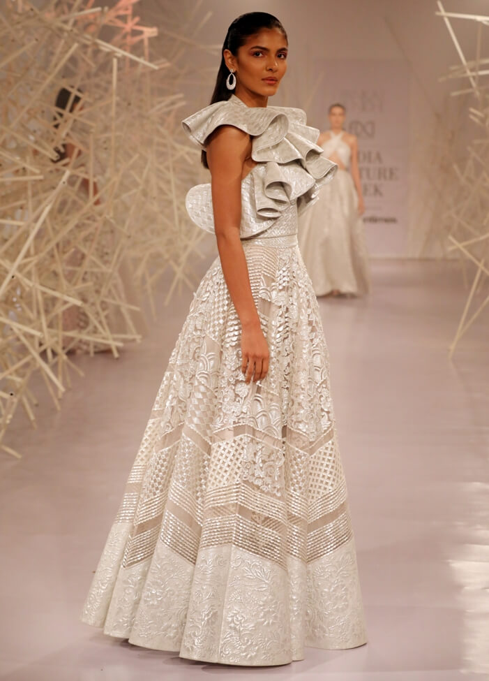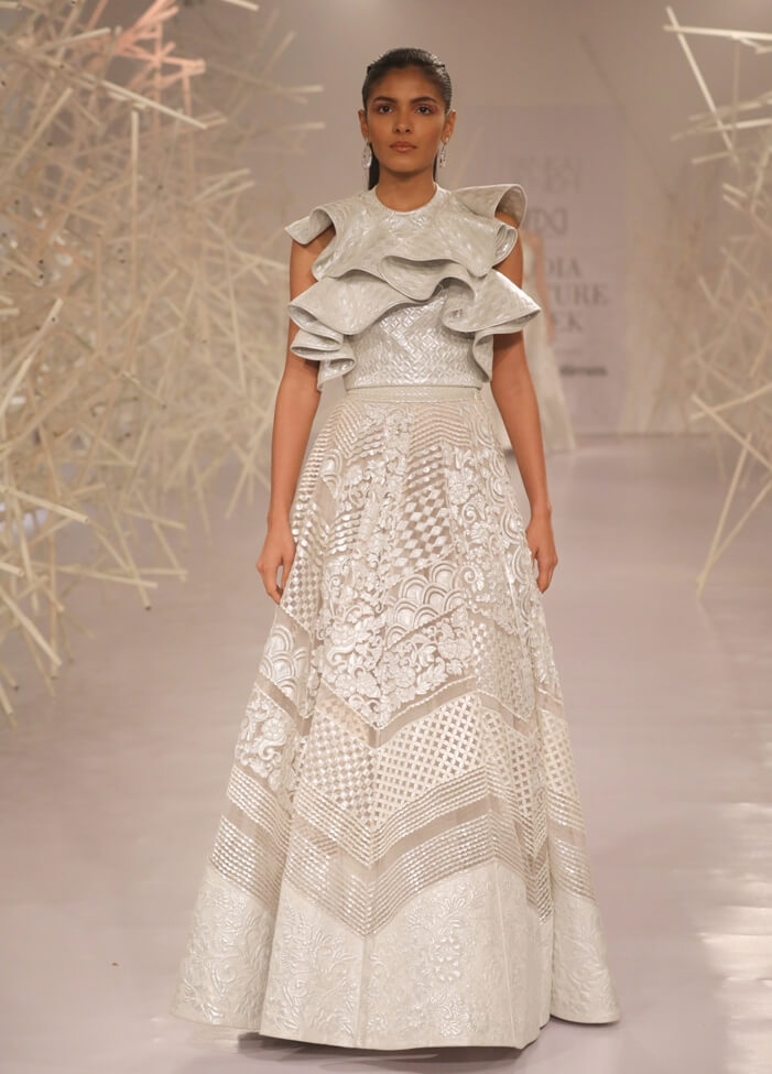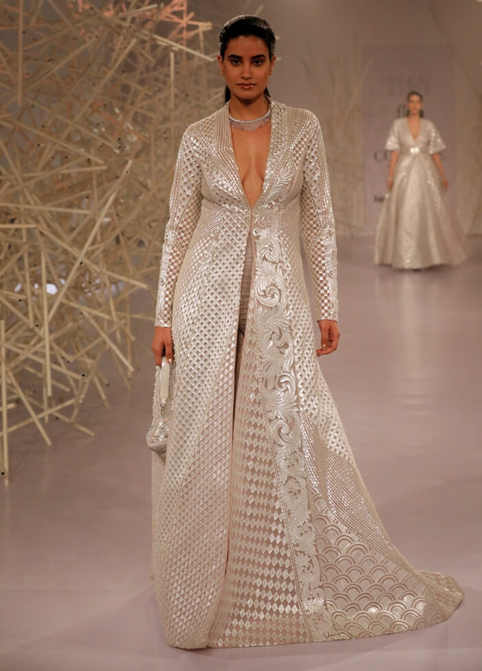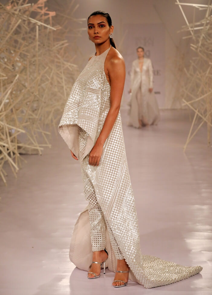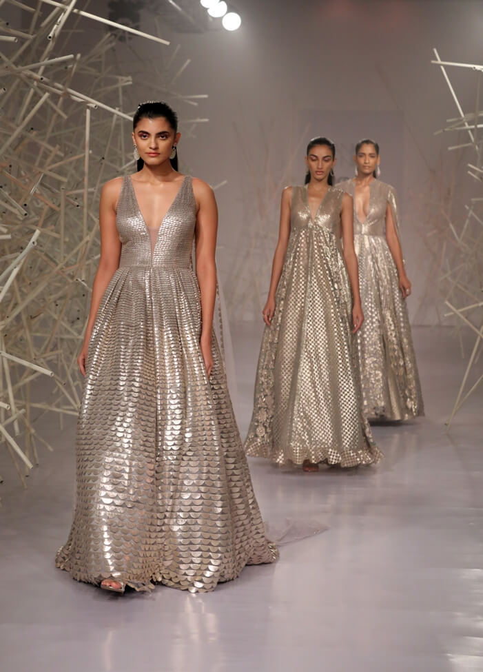 Pankaj & Nidhi’s Collection 2019 pays tribute to this period of magnificent ornamentation by recreating the same magic with artisanal dexterity on textiles. Three-dimensional, hand-cut appliqués and precision inlay work with metallic fabric biscuits have been rendered on translucent tulles and satin organzas to give a breathtaking effect to the garments. Precise and geometric embellished motifs turn a medieval inspiration into a graphic vision for the future.