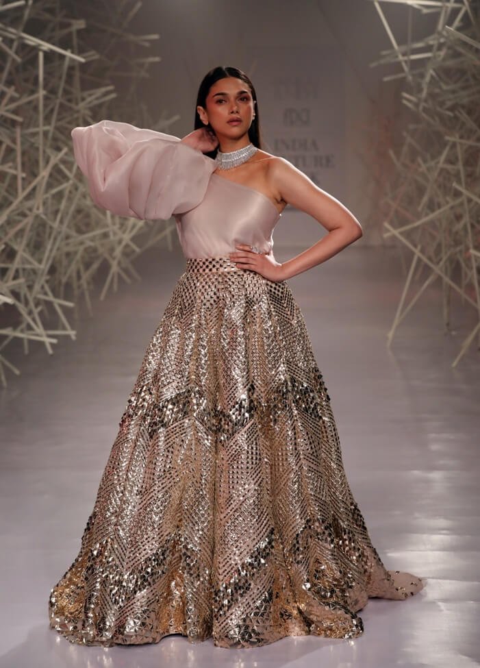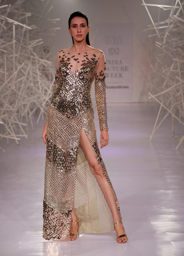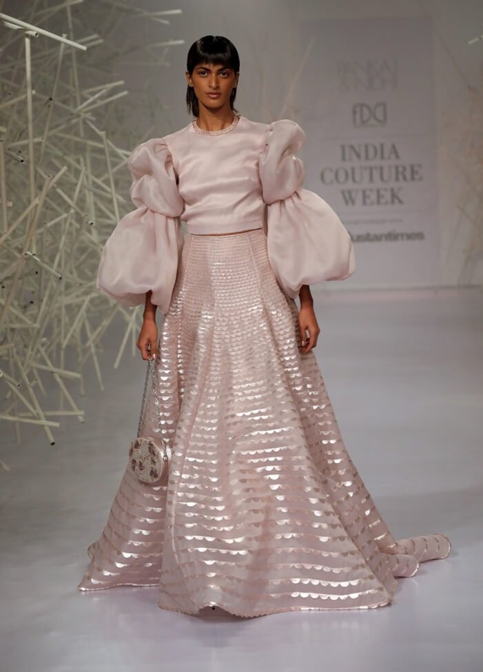 Pankaj & Nidhi’s Collection 2019 pays tribute to this period of magnificent ornamentation by recreating the same magic with artisanal dexterity on textiles. Three-dimensional, hand-cut appliqués and precision inlay work with metallic fabric biscuits have been rendered on translucent tulles and satin organzas to give a breathtaking effect to the garments. Precise and geometric embellished motifs turn a medieval inspiration into a graphic vision for the future.