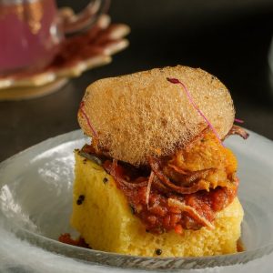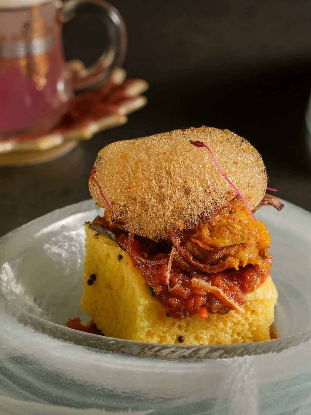 - Pahadi Mezcal Sour with Lamb Barbacoa Dhokla