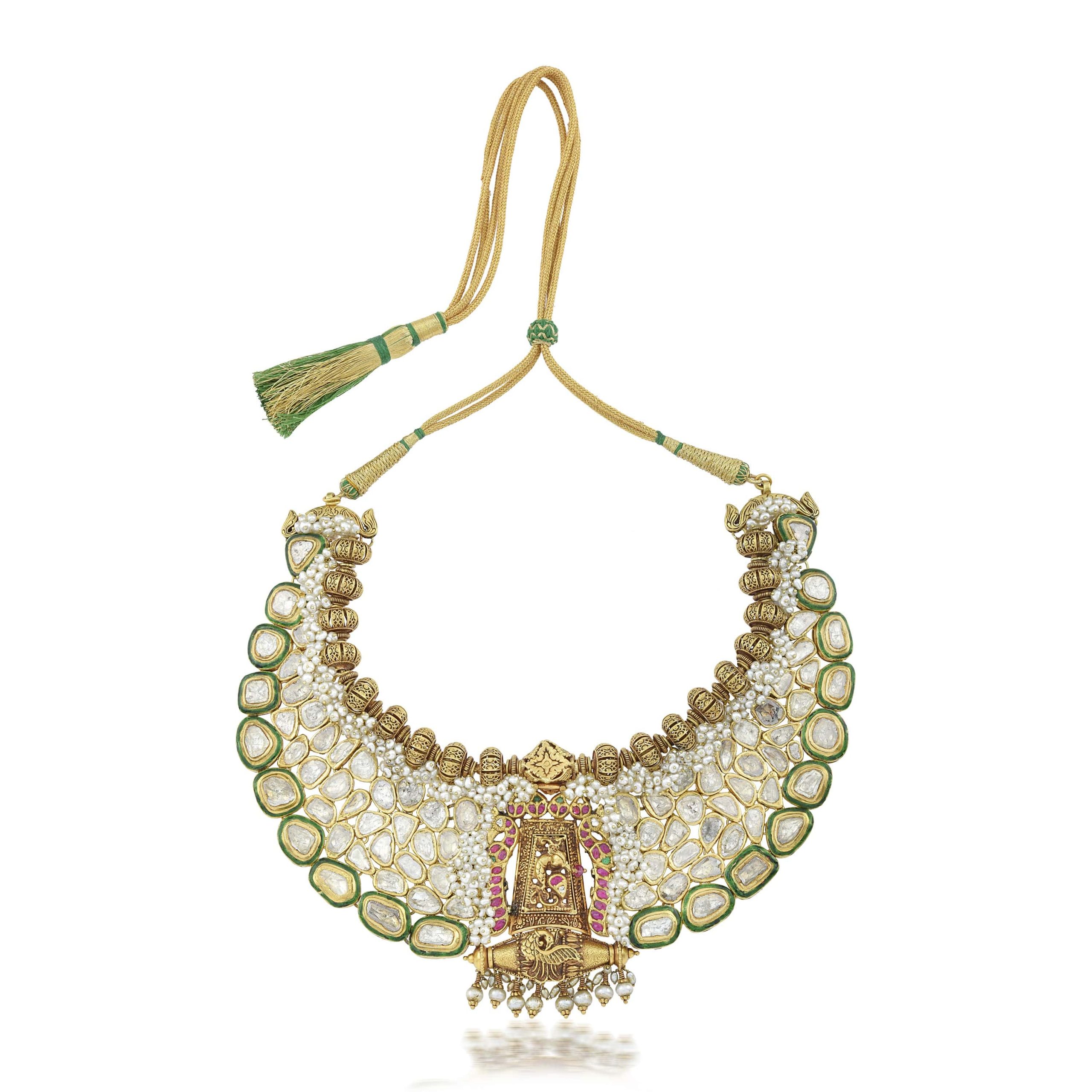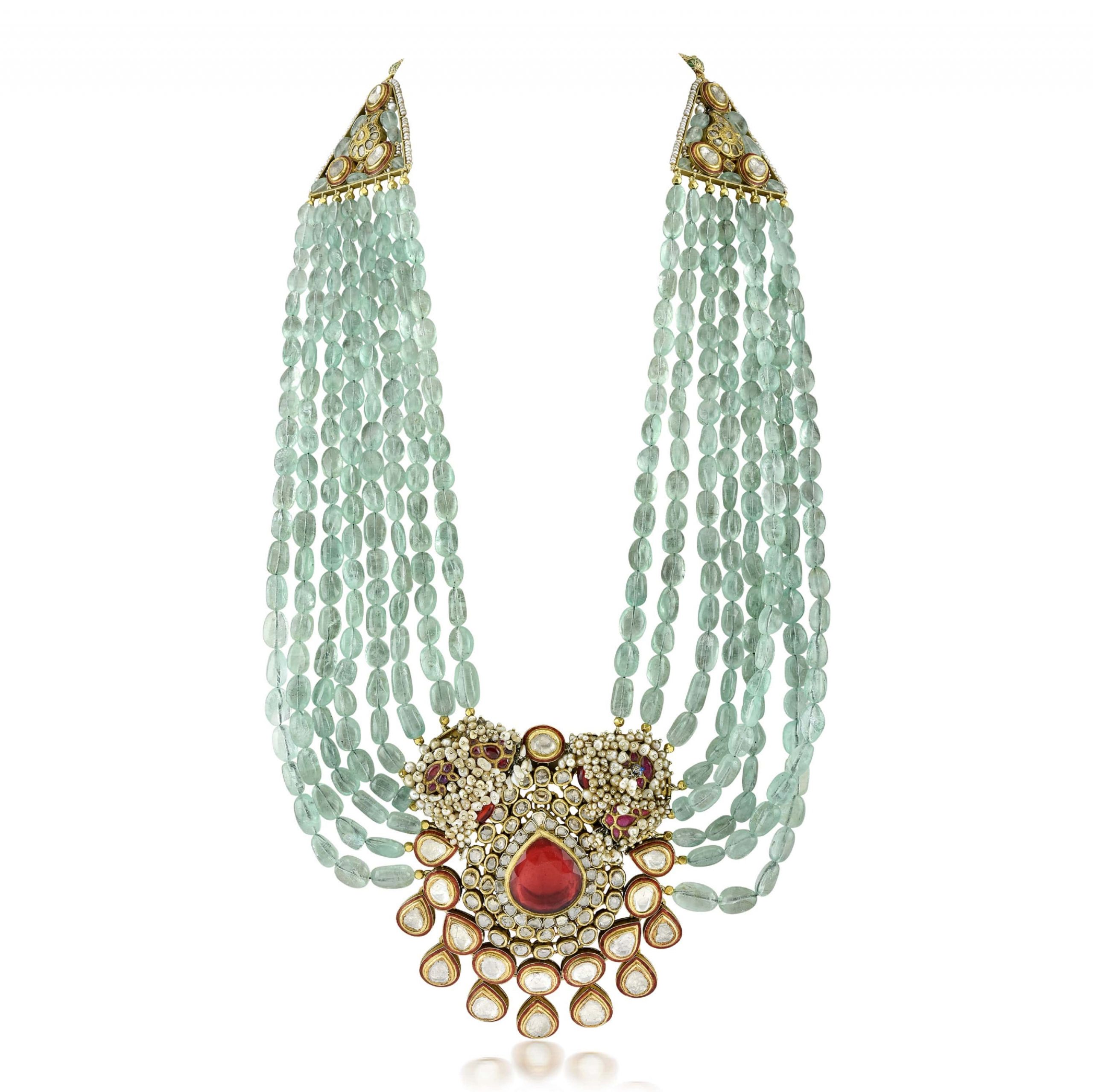 Amrapali Jewels offer statement and heavy pieces with a jadau collection that adds vibrancy and charm to it. Gold being perfect for the festive season as they are a sign of prosperity & auspiciousness. From colourful Tourmaline jadau necklace to Gold Jadau necklace with polki diamond rubies & pearls to Multilayer emerald bead jadau necklace, all types of traditional pieces in gold only from Amrapali Jewels.