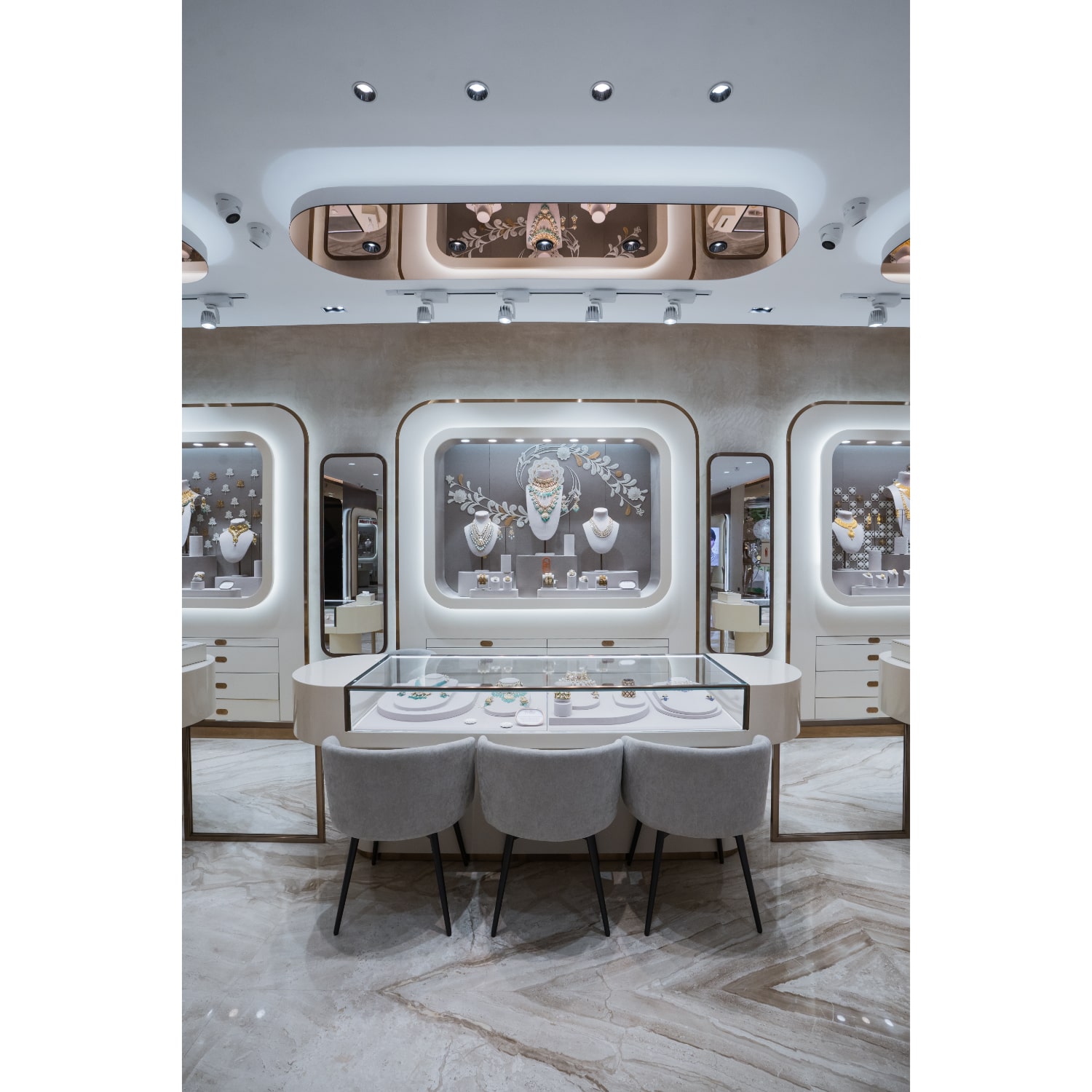 The new space design is conceptualized as open and inviting, allowing for more interactive and approachable jewelry display zones. One can experience display counter seating where a family or small group of 3-4 people can enjoy a dedicated space for their jewelry buying experience. The floor diverges into six sections that remove all the clutter. These sections dedicate specific kinds of jewellery such as plain gold jewellery, antique gold jewellery, Polki jewellry, bangles, chains, dainty pieces, and temple jewellery. In this way, a client gets a wide variety of choices that would be catered to in an organized manner.