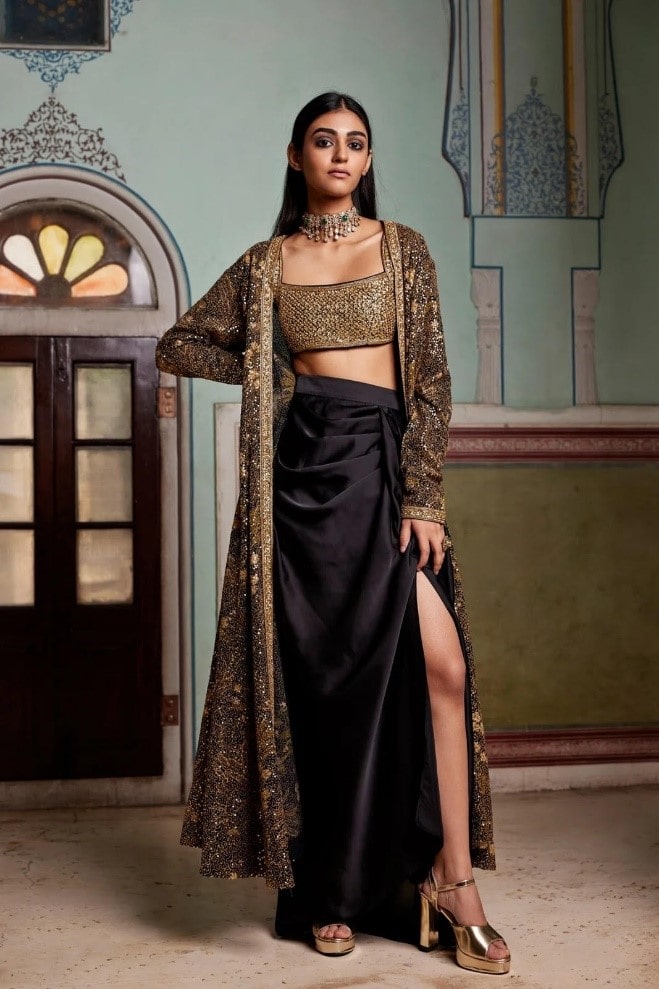 The black satin draped skirt with a thigh high slit comes with a cropped blouse with intricate booti detailing. Paired with a long full-sleeved georgette jacket with sequin work, this stunning three-piece outfit exudes grace and glamour.