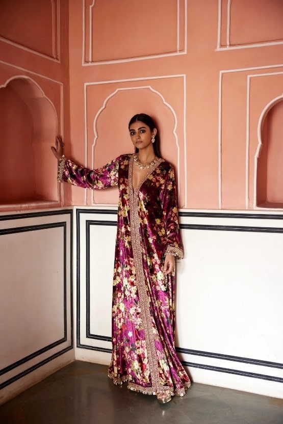 “Jashn is a celebration of our love for all that India resonates with that’s festivity, weddings and its crafts. Through this collection, we embrace the warmth of winter weddings and the new beginnings the festival Lohri brings with it. We have explored the versatility of velvets in rich, jewel tones and celebrate it with enticing motifs and embellishments.” – Radhika Rawat Chopra, founder, Prints By Radhika