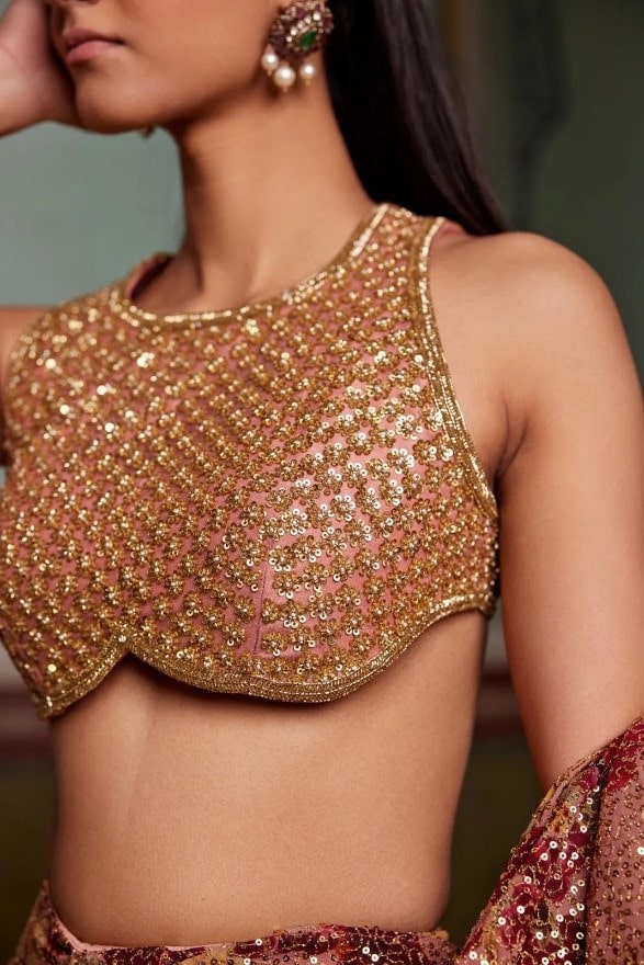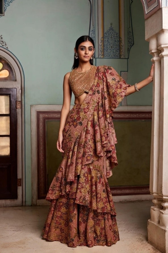 Spruce up the wedding season look with the Ruffle Saree set embellished to perfection. The elegant yet versatile georgette printed sequin saree comes with a booti work blouse featuring intricate sequin detailing.
