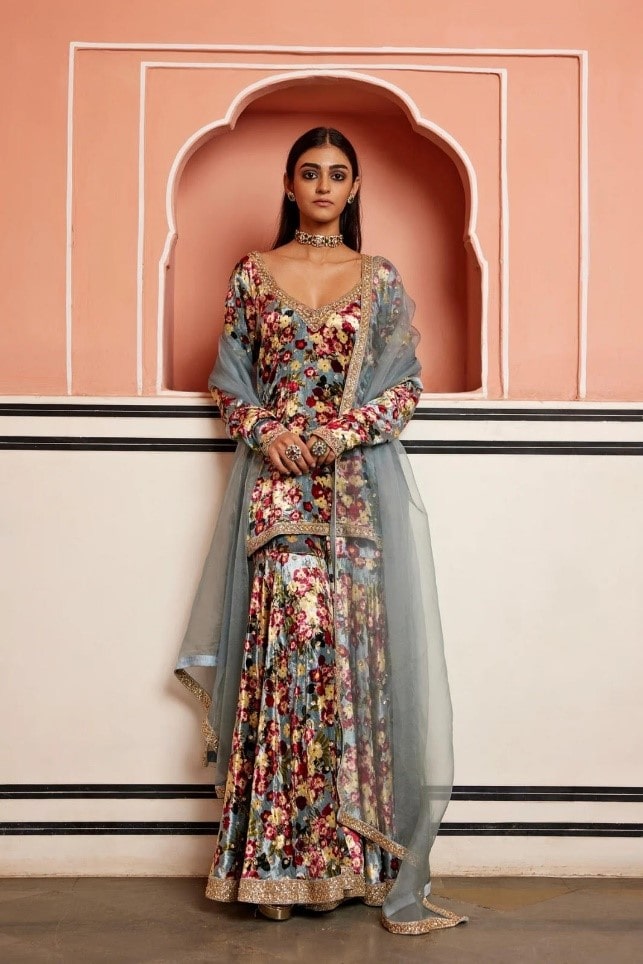 Celebrate the festive season in this luscious grey printed velvet kurta gharara set. The hand embroidered intricate detailing on the silhouette adds sparkle to the overall set. The embroidered organza dupatta paired with the deep V-neck short kurta and flared gharara completes the festive look.