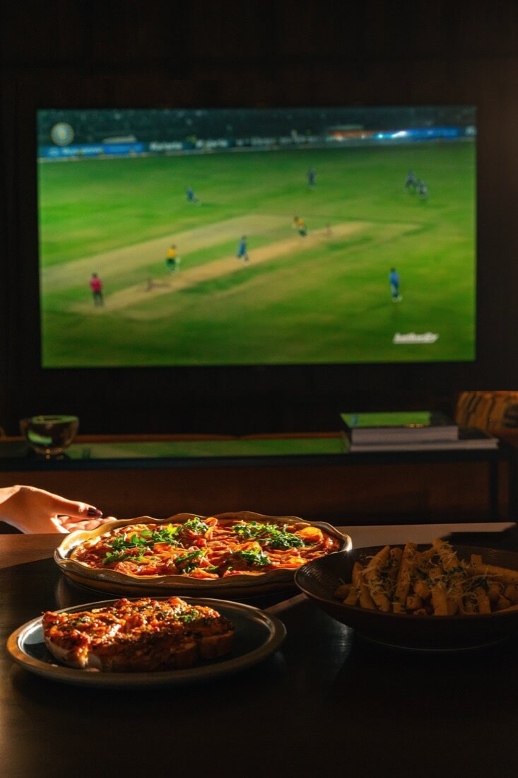 Framed by plush seating, wood finishes, green marble accents, and ambient lighting, Reflections blends contemporary style with the energy of live sport, offering a polished yet spirited destination for cricket evenings at JW Marriott Mumbai Juhu..