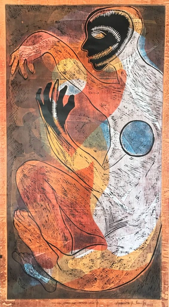 Dattatraya Apte’s black-and-white prints, made during the lockdown, convey feelings of solitude and loneliness. “Reflections CP” captures reflections on glass within a marketplace, symbolizing the isolated nature of modern life. “Lockdown Reflection I” freezes a moment in time, showing a figure surrounded by pandemic-related objects, highlighting the surreal atmosphere of the era. With young and old artists expressing their art of printmaking in varied forms and techniques, Apte believes it’s a promising future for printmaking with its own challenges of the time “I can see that the collective efforts of Indian Printmakers Guild and Multiple Encounters have created a space for young printmakers. This is visible in major art exhibition where quite a few numbers of prints are exhibited.” “More institutions are introducing printmaking as subjects in schools and universities. The work is not yet over as new challenges are coming. The advent of digital technology is one of them, it is competing with other techniques of expression and is visible in all the spheres of artistic expressions,” concludes Apte