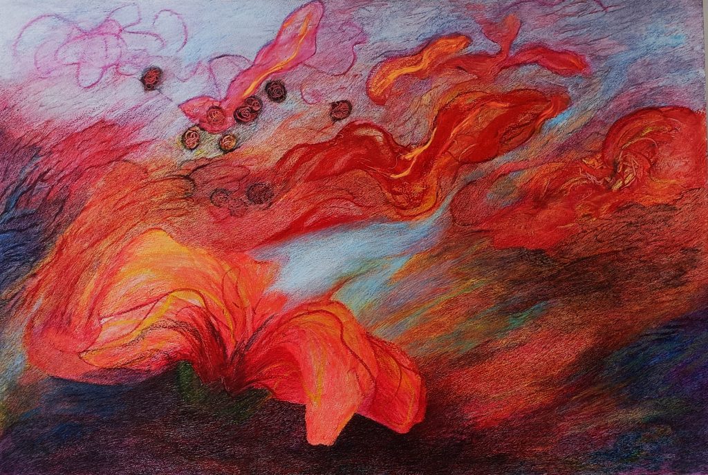 Anandmoy Banerji’s recent series, explore the struggles of individuals facing existential crises amidst societal changes. Using only two colors, flesh pink and black, Banerji employs scratches, flowing lines, and solid shapes to create captivating forms and tones. The artworks depict limbs floating in space, shifting between menacing and serene expressions, suggesting the personal battles each person faces alone. At a broader level, they reflect society’s challenges, with hope for positive change despite current hardships, as seen in his series “The Dark Night,” created during the Covid-19 pandemic