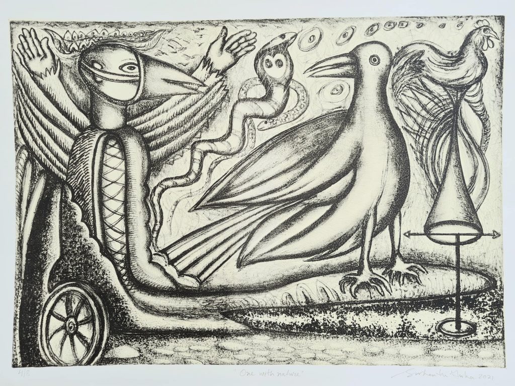 In Sushant Guha’s drawings and lithographs, he uses strong lines and simple pictures to express big ideas. He’s been making art for thirty years, changing how people think about drawing on stone. He mixes his art with literature and ideas, making it rich with feelings and thoughts about the world.