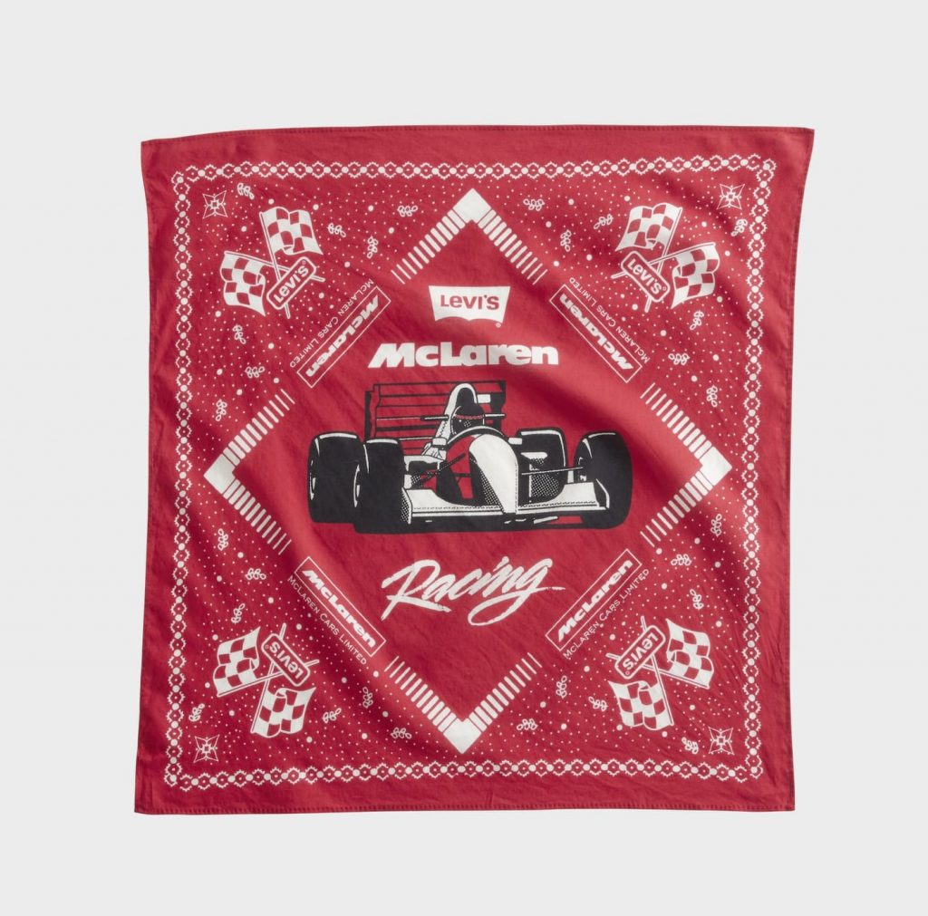 To honor the McLaren Racing heritage, the jeans feature vintage-inspired patches and a red co-branded back patch. The Constructors Tee features a printed front graphic of an ‘80s era McLaren race car. And finally, the Racing Bandana reinterprets classic Levi’s® western motifs through a racing lens with ‘80s McLaren graphics.