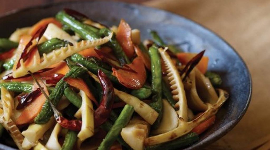 Finely slice lamb and add to a bowl with salt, peanut oil, some corn starch, and some water. Let marinate for approx. 10 min. Soak dried mushrooms in a bowl with warm water for approx. 5 – 10 min. Finely slice red pepper, bamboo shoots, and soaked mushrooms. Chop garlic, ginger, and spring onion.