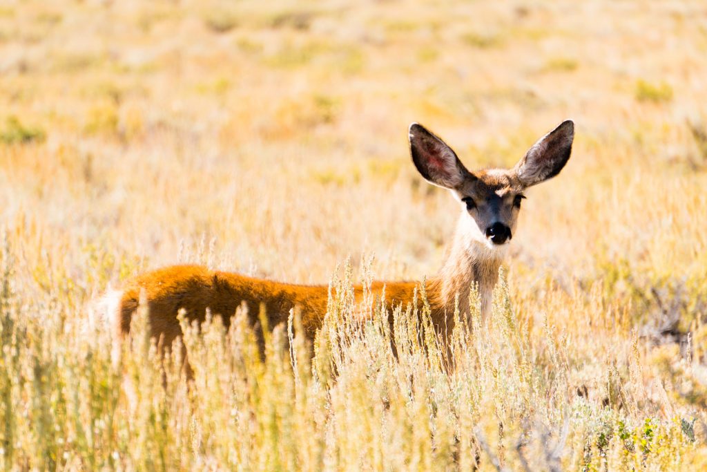 Mule Deer: Mule deer are characteristic of the Sierra Nevada and are usually a dark grey-brown, with a small white rump patch and a small, black-tipped tail. Mule deer migrate to higher elevations in spring and summer, and to lower ranges in fall and winter.