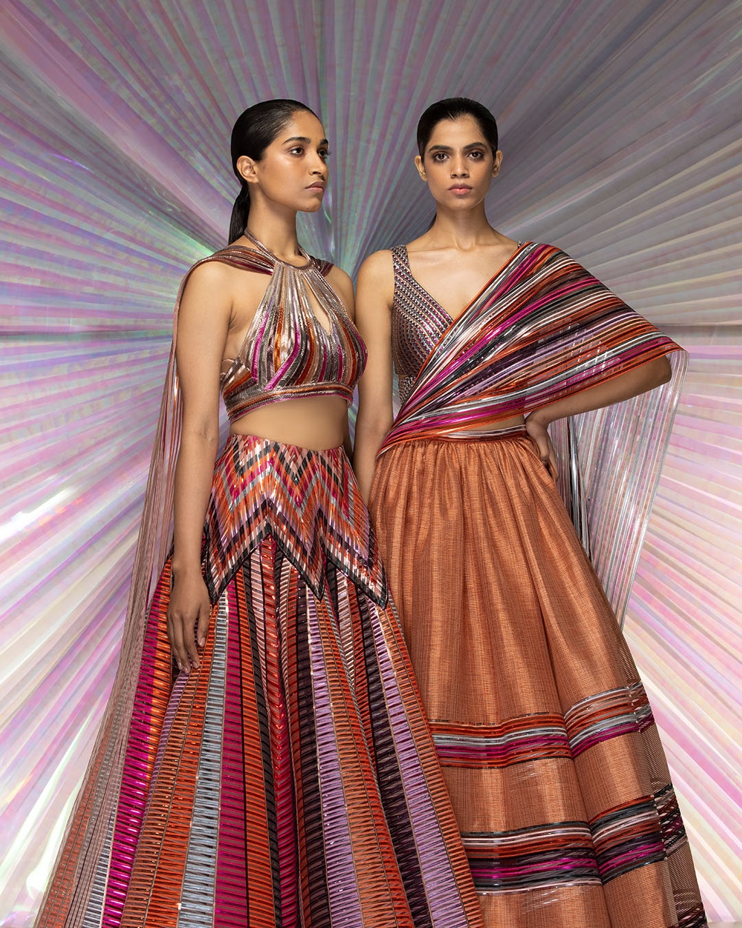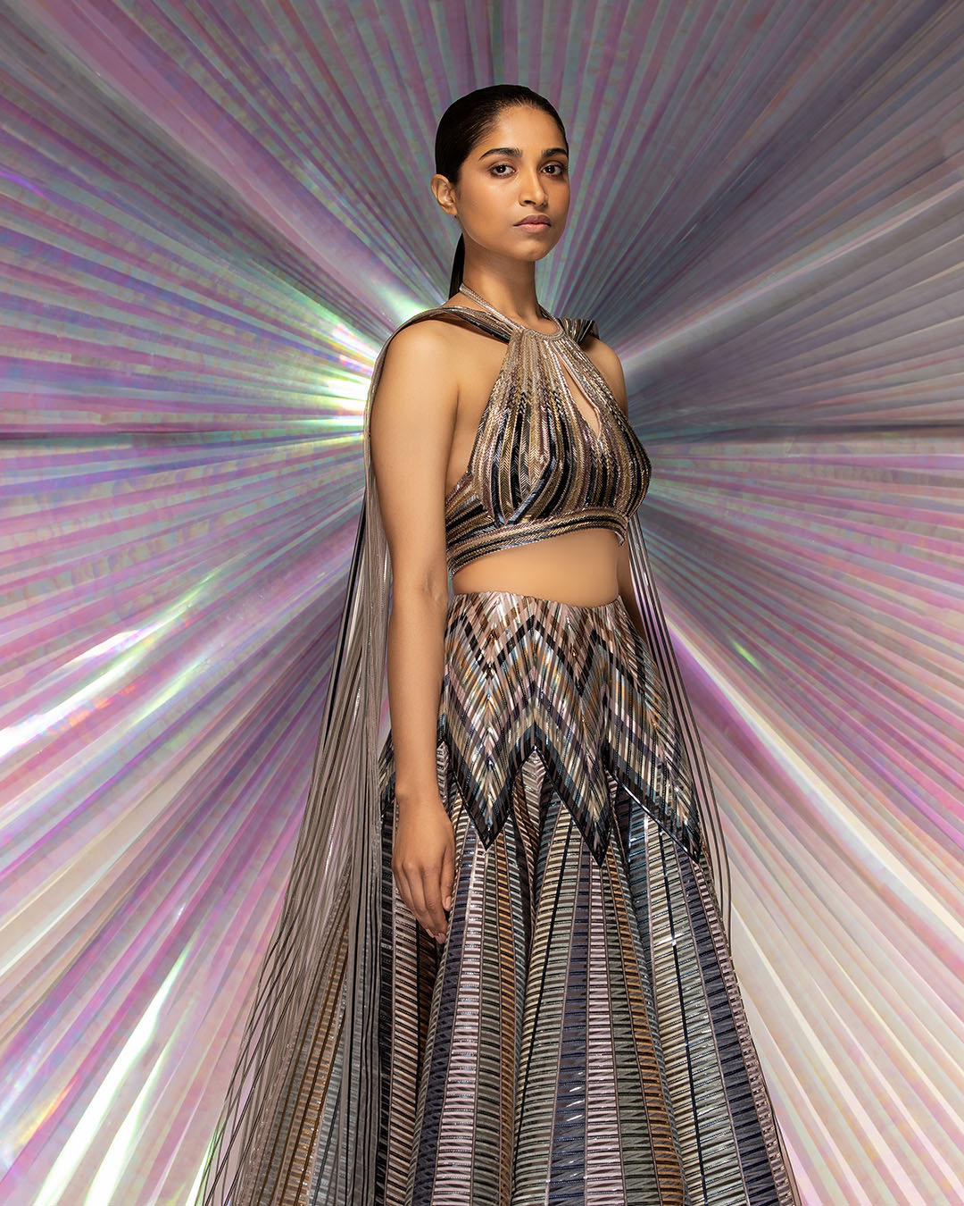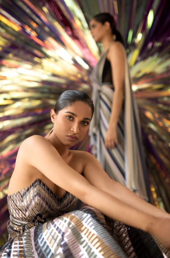 The collection features menswear and womenswear across couture, luxury pret and classic brand pieces. The collection dives deeper into Amit Aggarwal’s signature textiles in metallic polymer of brilliant colour and the brand’s unique ability to structure fluid textiles into modern-day couture. Rubber cording is hand embroidered on multicolour textiles created by handweaving polymer, with added details in silk thread cording, glass pipes and ceramic beads.