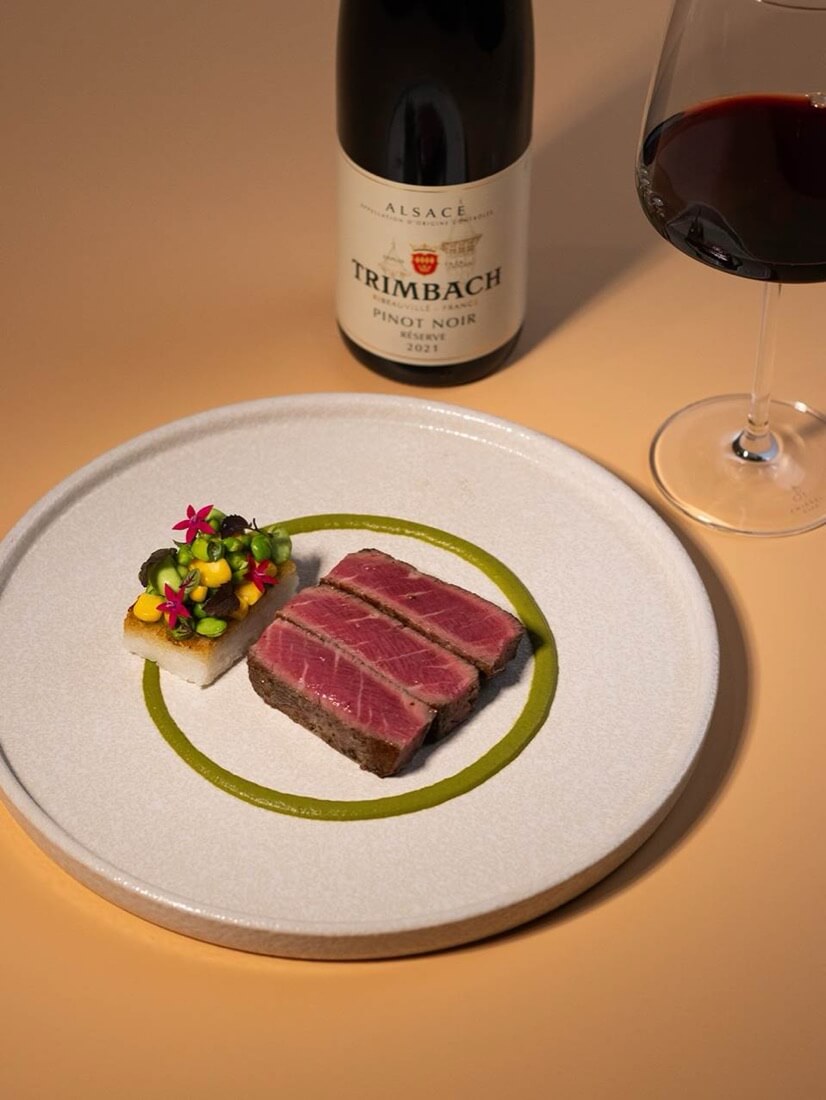 After laska lime sorbet to cleanse the palate, the main is grain 150-day Black Angus tenderloin with eggplant puree, beef jus infused with homemade chili and basil, accompanied with Vietnamese ST25 fragrant rice with corn and green beans.
