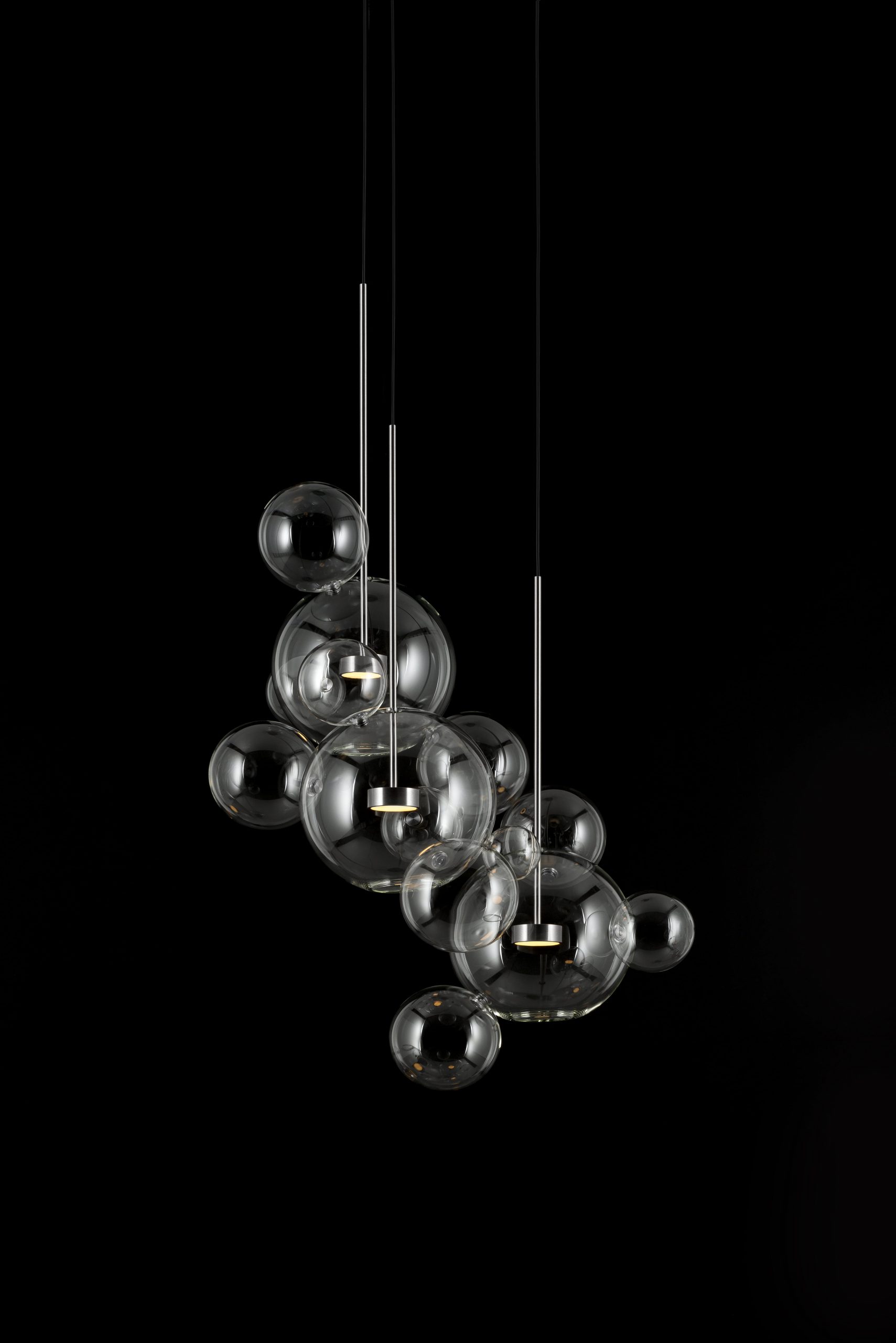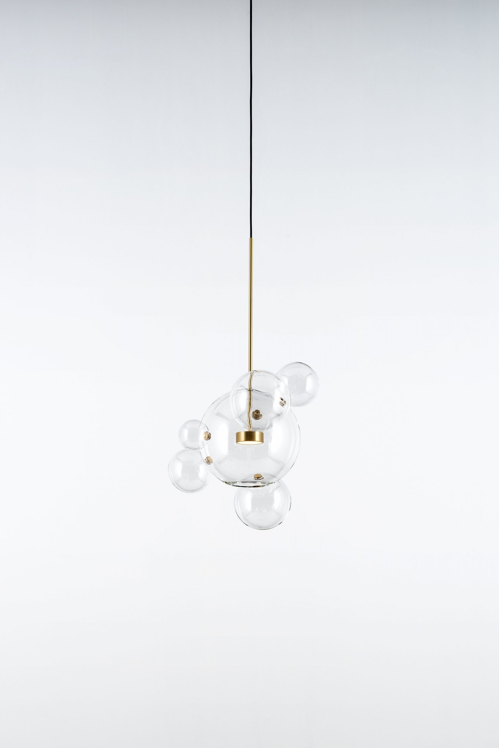 Conceived during a tranquil walk surrounded by floating soap bubbles, the collection encapsulates the lightness and immateriality of light itself. Each lamp is meticulously handcrafted in transparent glass, with a brass light source suspended gracefully between the spheres, as if floating mid-air. The interplay between the luminous core and the curved glass surfaces creates an enchanting dance of reflections, bringing a touch of magic to any space.