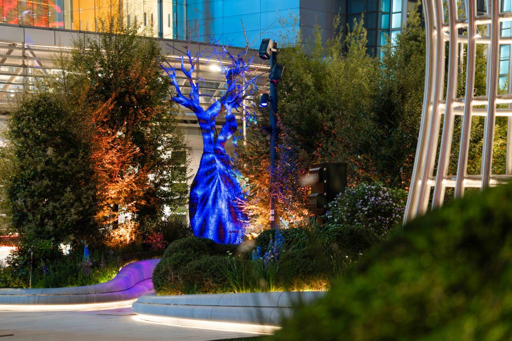 The world’s first permanently installed digital light artwork created by German digital artist Philipp Frank, Hypnotic Dream, translates a tree’s inner frequencies into abstract light projections on the 200-year-old Chorisia tree in the Art Garden, complemented by immersive soundscapes.