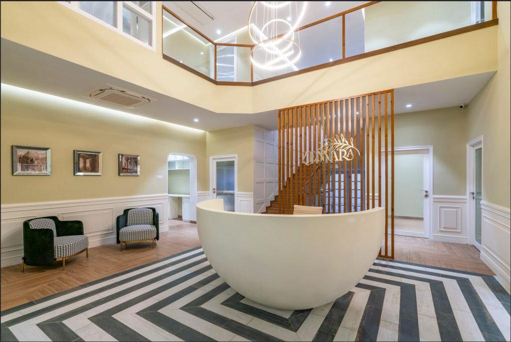 concentric patterns—motifs that quietly echo throughout the interiors. A sculptural chandelier of concentric rings descends in gentle arcs, evoking the sacred geometry of mandalas. It anchors the volume without overwhelming it. A nearby water feature murmurs softly, grounding the space in serenity. The drama here is in the details; the opulence, in the restraint.