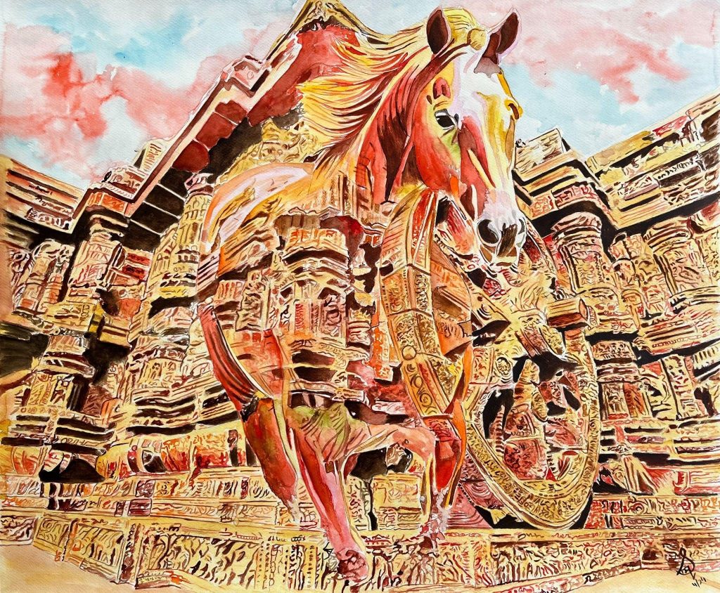 This artwork celebrates the magnificent temple heritage of our country – the chariot of Lord Surya at Konarak is depicted in its full grandeur and the powerful horse represents the seven horses pulling the Sun Chariot. I hope you appreciate the attention to detail in this creation!!