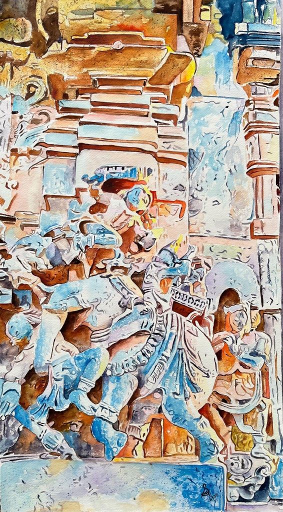 “This Beautiful World” is a celebration of the extraordinary beauty that surrounds us, brought to life through 40 exquisite watercolor paintings by Dr. Mahajan. Among these, a special highlight is a collection of 10-12 artworks dedicated to temple art, capturing the architectural grandeur and intricate details of iconic temples such as those of the Konark, Hoysalas, and Cholas.