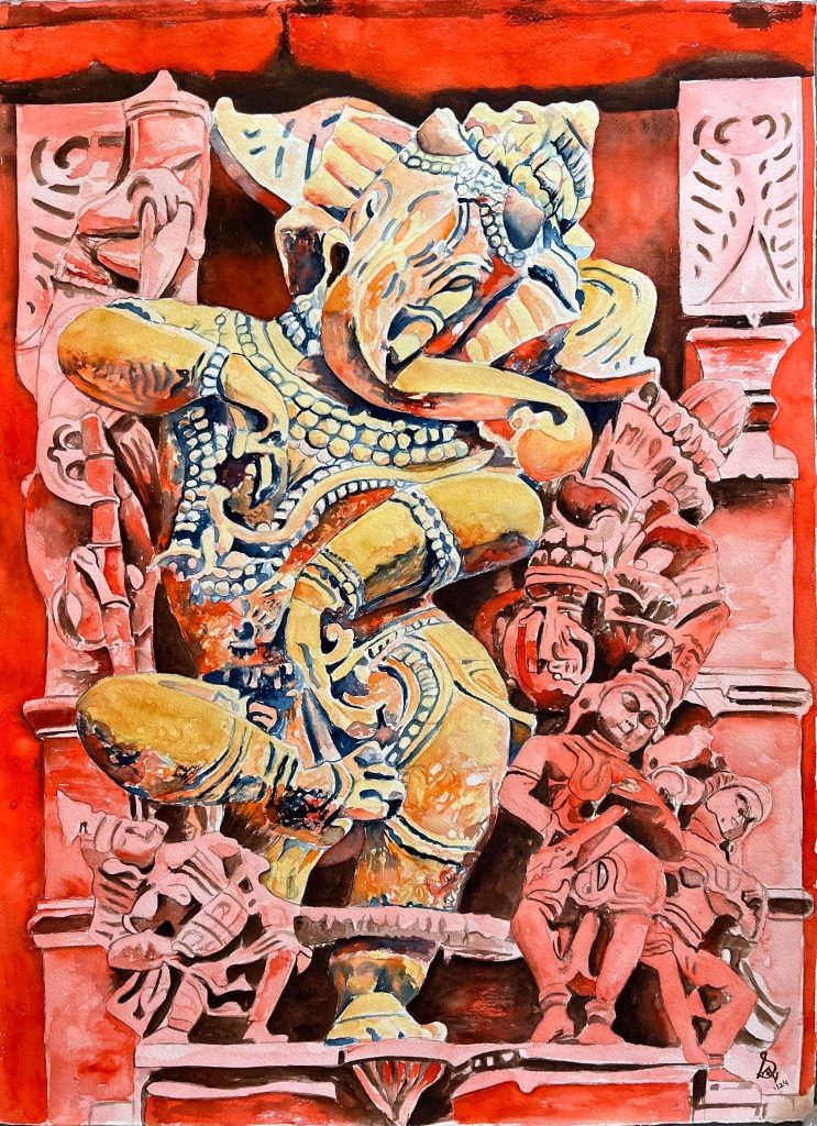 domains as well that led her to try doingTemple Art. Temple Art itself has strong, powerful and sacred interpretation. Temples are situated on sacred geographies. However, Sushma is not looking at the geography but at specifics, magnifying certain elements. She recreates with an unmatched precision the minutest of details from the iconography to the splendid attire and jewellery of the many Gods she has painted. Temple art is complete with highly decorative elements. From the dancing Ganesha to the epitome of primordial masculinity, the richly ornamental Lord Shiva from the Hoysala Temple to the architectural elements of the Chariot Wheel of the famed Virupaksha temple at Hampi, Sushma has painstakingly re-constructed and explored comprehensively the beauty of the world around her. And this naturally led to the title of her forthcoming exhibition – “This Beautiful World”.